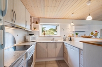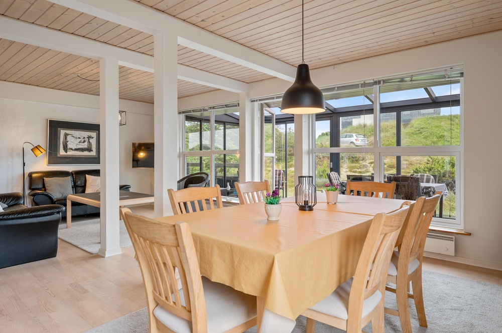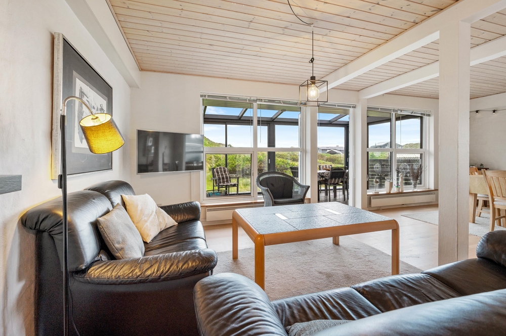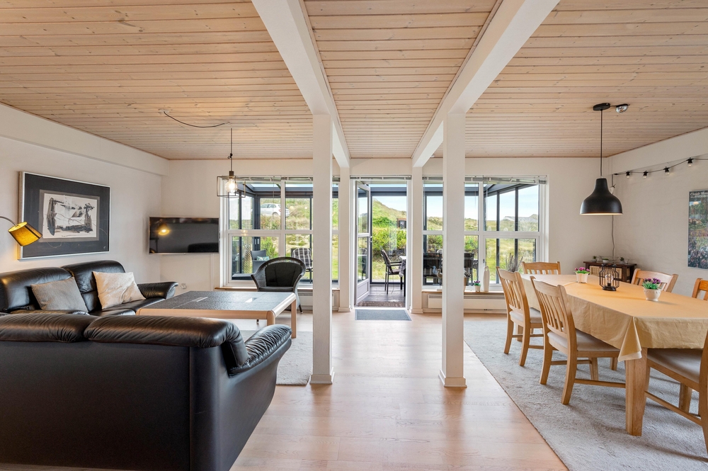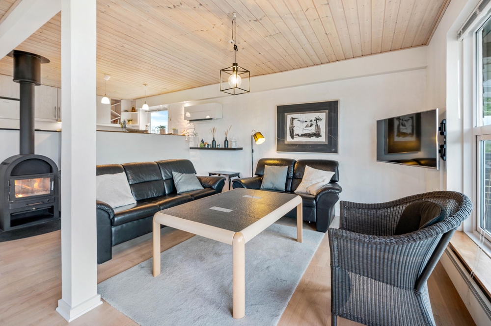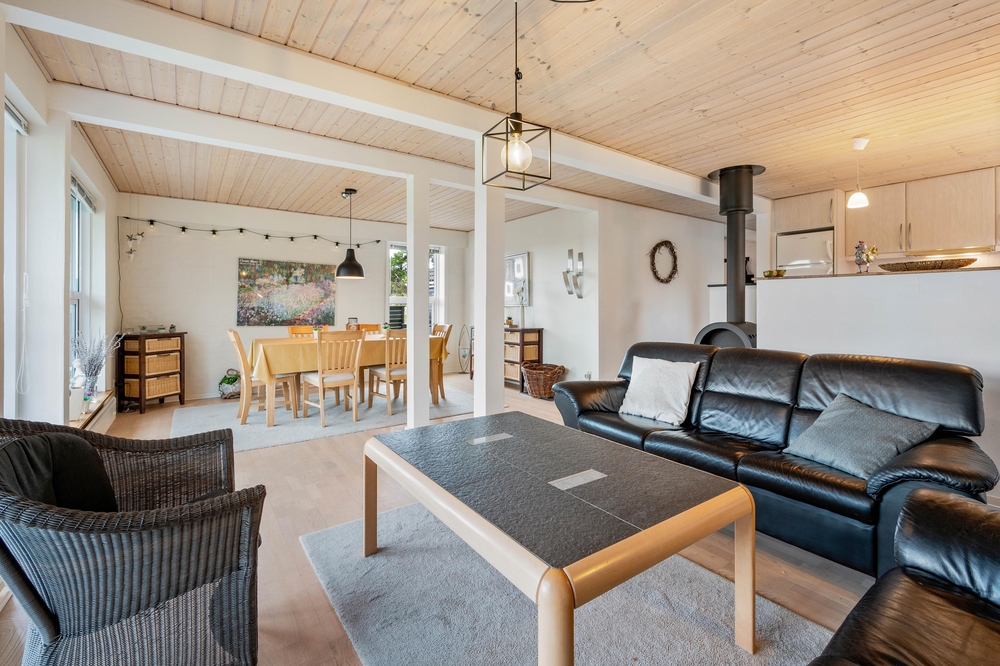 Das Ferienhaus im Spættedalen 4 hat ein schönes großes Wohnzimmer mit Holzofen und Balken. Nach einem schönen langen Spaziergang am Wasser könnt ihr euch auf dem Sofa zurücklehnen und den Holzofen genießen. Das Wohnzimmer ist direkt mit der Küche verbunden, sodass jeder beim Kochen oder der Planung von den nächsten Urlaubsaktivitäten helfen kann.