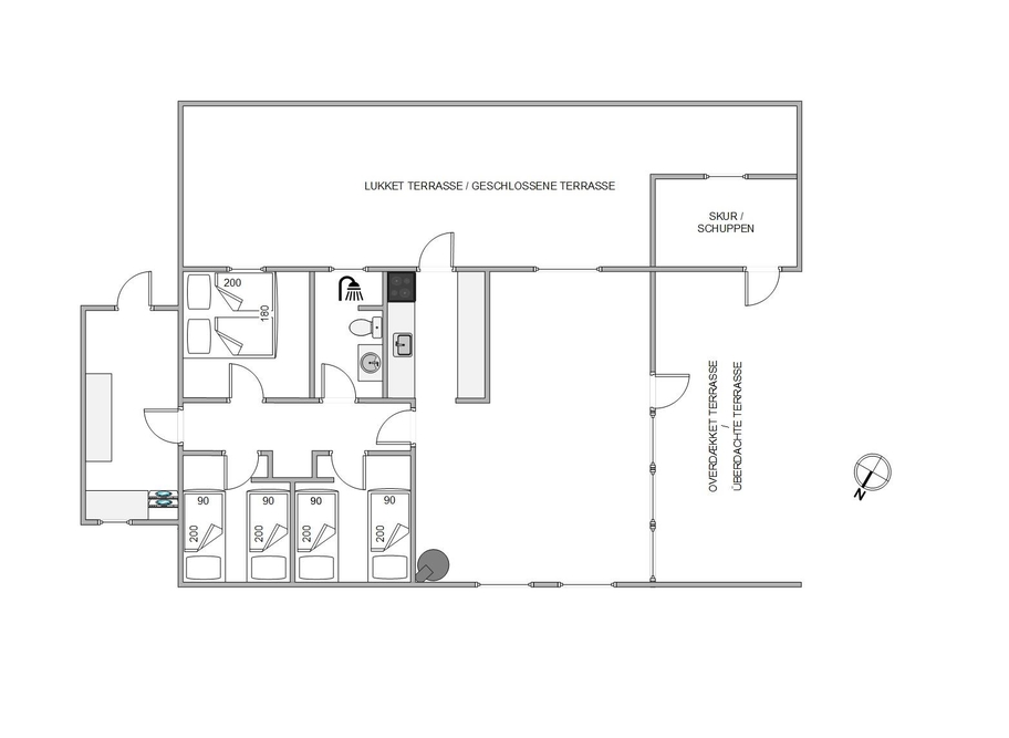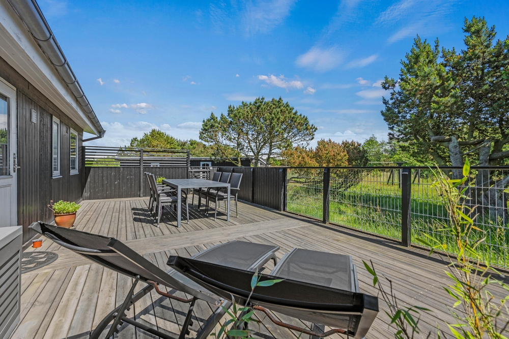 Die andere Terrasse ist komplett eingezäunt und mit guten Gartenmöbeln und Liegestühlen ausgestattet. Nach einem erlebnisreichen Tag in der Sonne, könnt ihr den Grill anzünden und köstlich zubereitete Speisen genießen. Hier steht euch auch eine Außendusche zur Verfügung (von April bis November) ? perfekt nach einem schönen Tag am Strand, der sich nur 850 Meter entfernt vom Ferienhaus befindet.