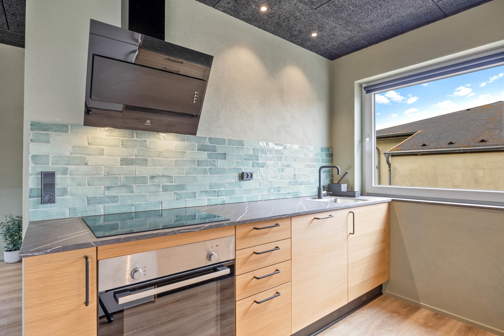 In der funktionellen Küche findet ihr einen modernen Induktionsherd mit Ofen und Dunstabzughaube, einen Kühlschrank mit 40 L Gefrierfach und einen Geschirrspüler.