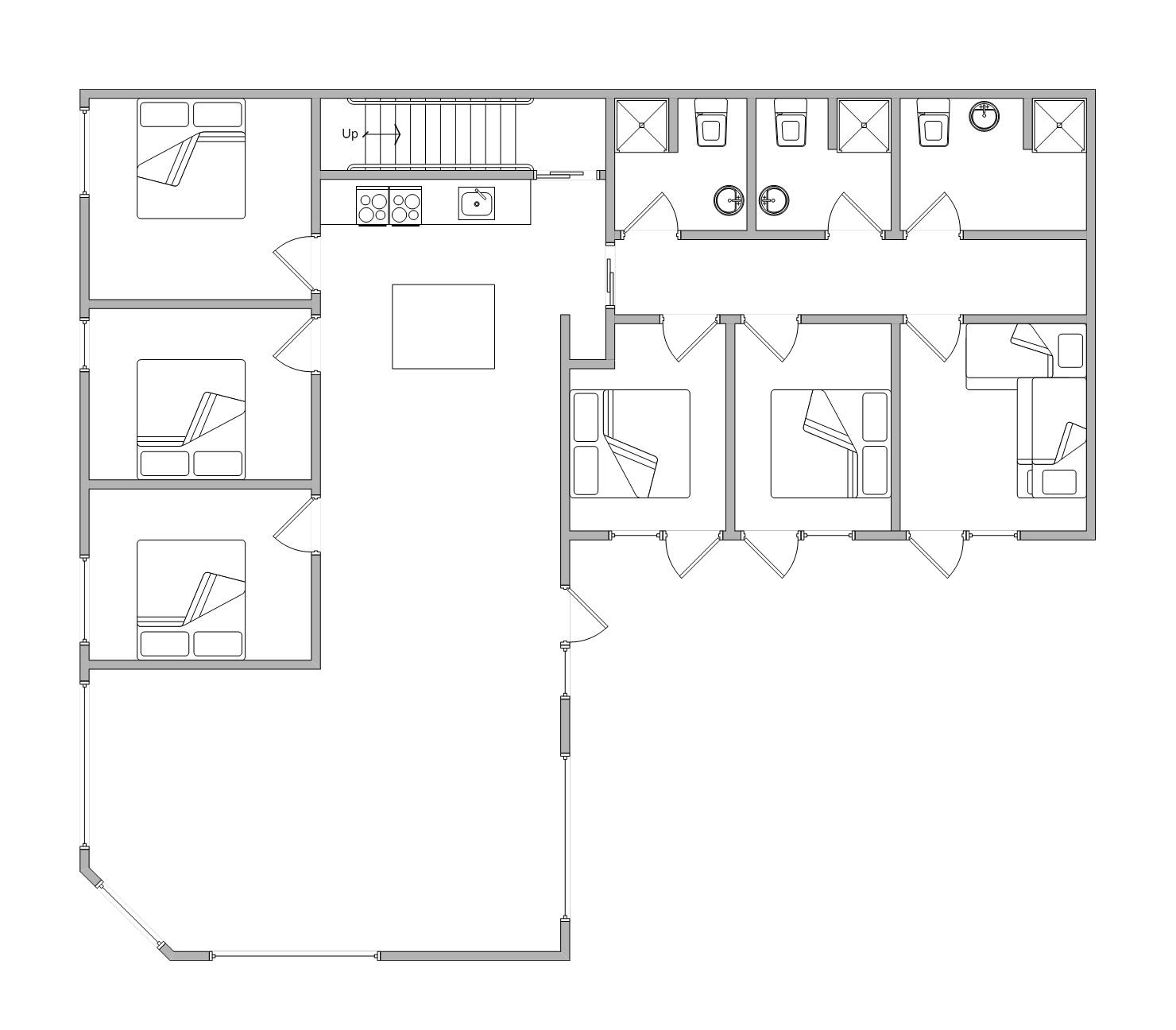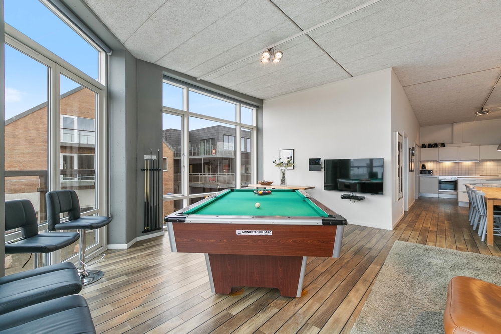 Mit den sechs Schlafzimmern, den drei Badezimmern und dem großen Küchen- und Wohnbereich bietet diese schöne Wohnung genügend Platz für 12 Personen. Die helle und geräumige Einrichtung lädt zum gemeinsamen kochen, Filmabende oder einer kleinen Partie Billard ein.