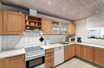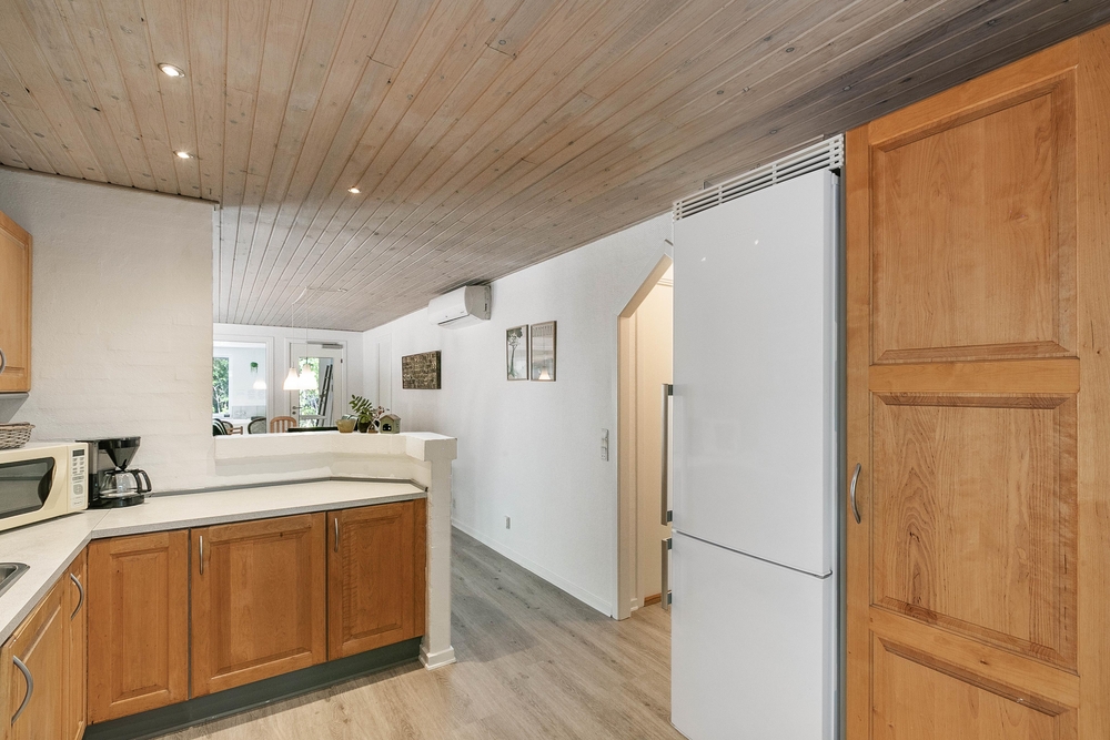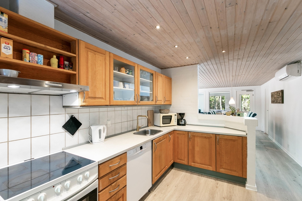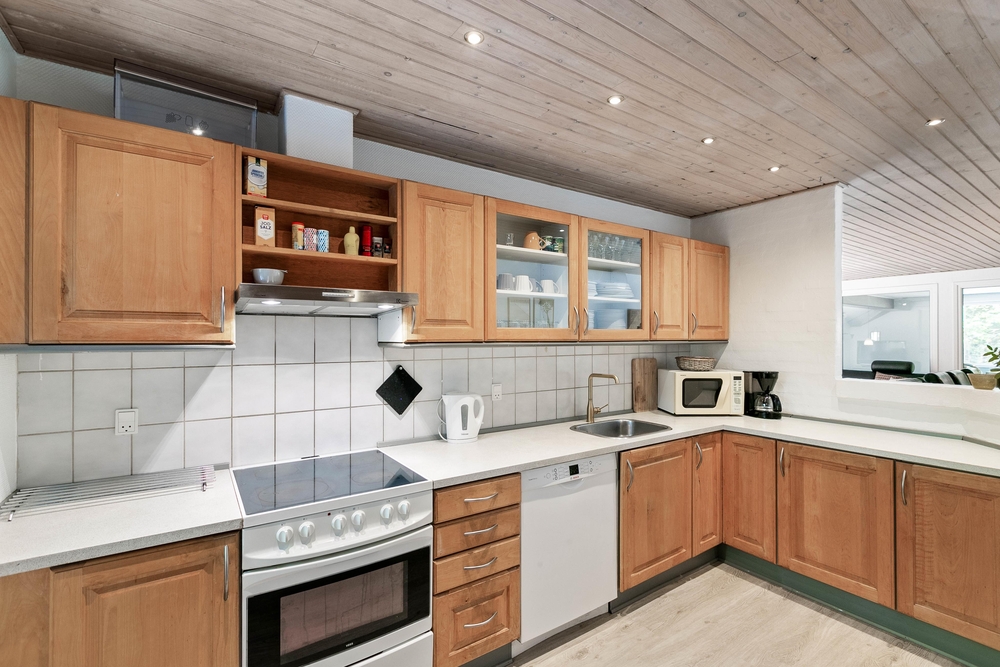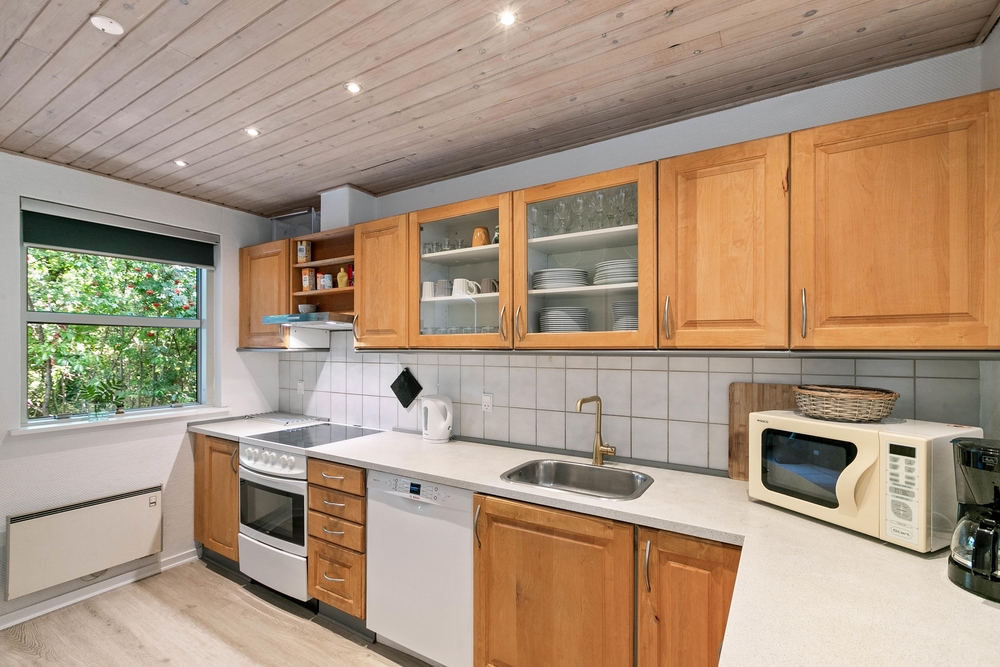 Der geräumige und helle Wohnbereich lädt mit komfortablem Möbel und einem schönen Kaminofen zu behaglichen Abenden ein. Die moderne und voll ausgestattete Küche bietet alles, was für die Zubereitung köstlicher Mahlzeiten benötigt ist. Die Küche ist nicht nur mit einer Spülmaschine ausgestattet, sondern auch mit einem hochwertigen Herd, einem Kühlschrank mit Gefrierfach und einer Mikrowelle.