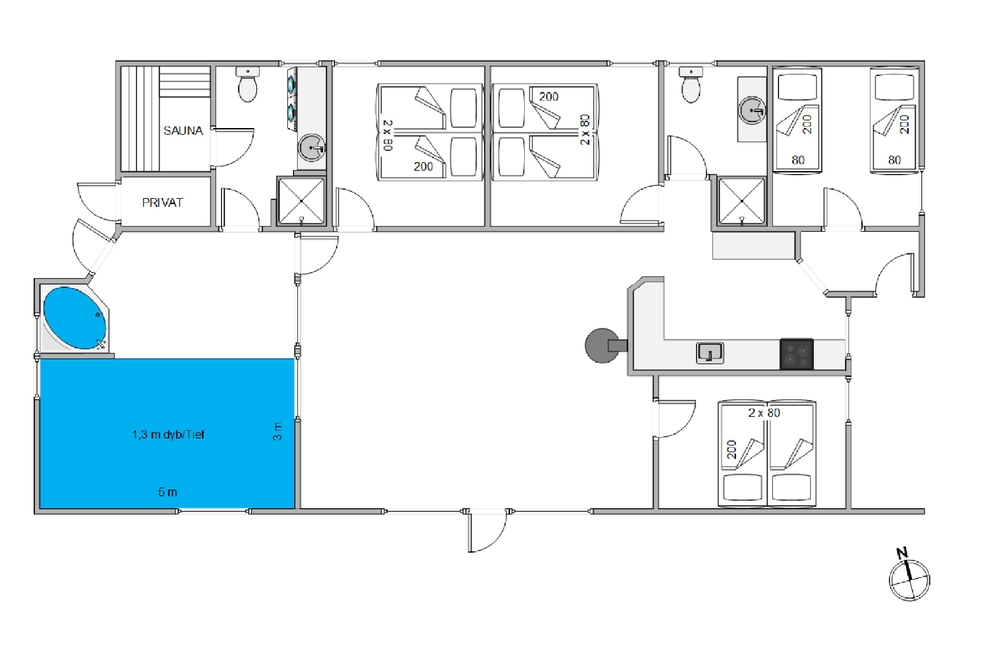 Ein absolutes Highlight des Ferienhauses ist der großzügige Wellnessbereich, der das Gefühl eines persönlichen Spa-Erlebnisses vermittelt. Der Swimmingpool bietet die perfekte Gelegenheit, sich von den Aktivitäten des Tages zu erfrischen oder einfach nur eine entspannende Runde zu schwimmen. Nach einem langen Tag voller Abenteuer sind auch die Sauna und Whirlpool ideal, um sich in wohltuender Wärme zu entspannen und die Muskeln zu lockern.