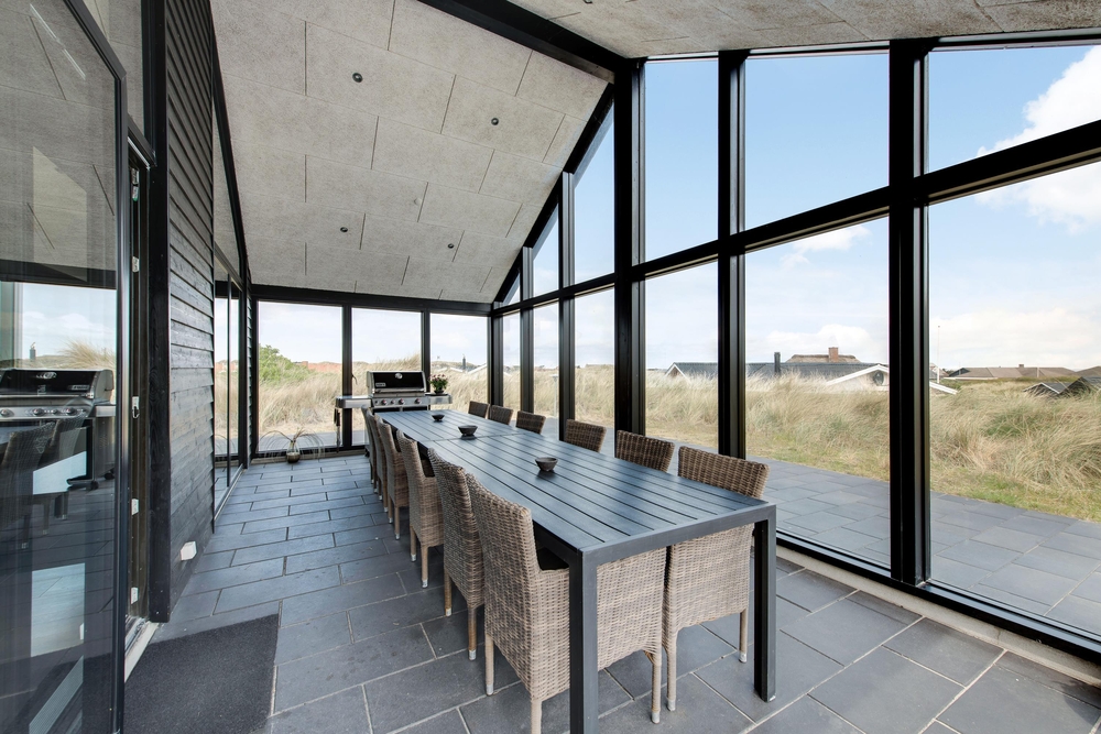 Der verglaste und überdachte Teil der Terrasse bietet sich wunderbar für Barbecues und lange Abende im Freien an. Rund um das Ferienhaus findet ihr bequeme Loungemöbel auf denen ihr es euch je nach Windrichtung gemütlich machen könnt.