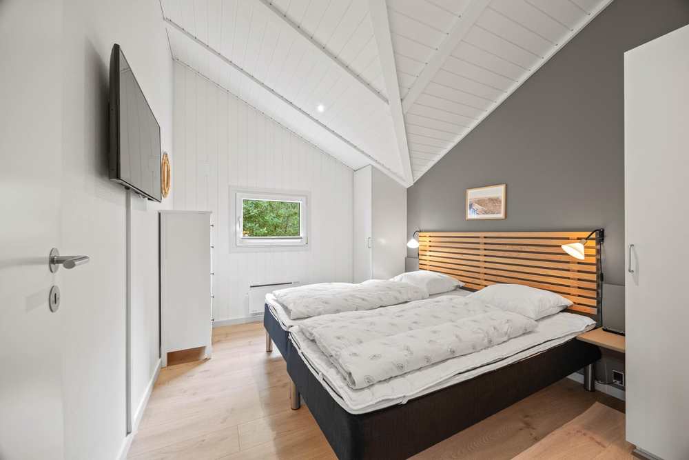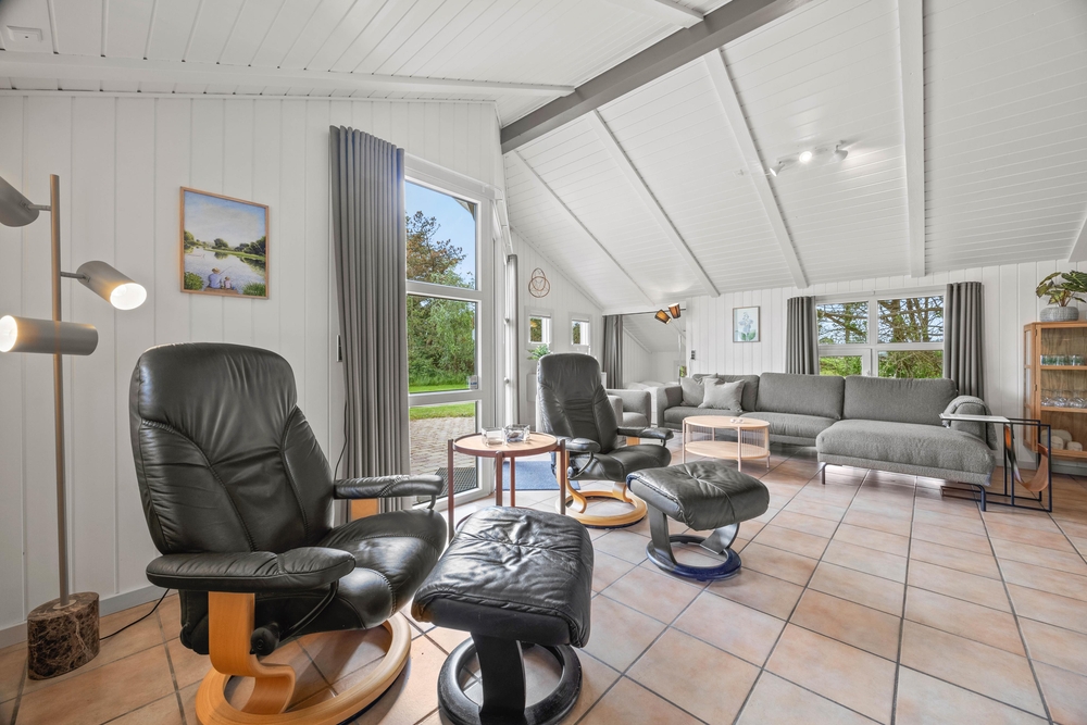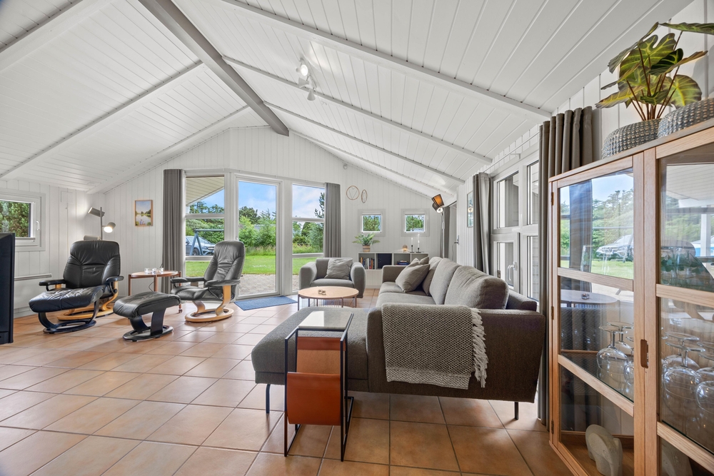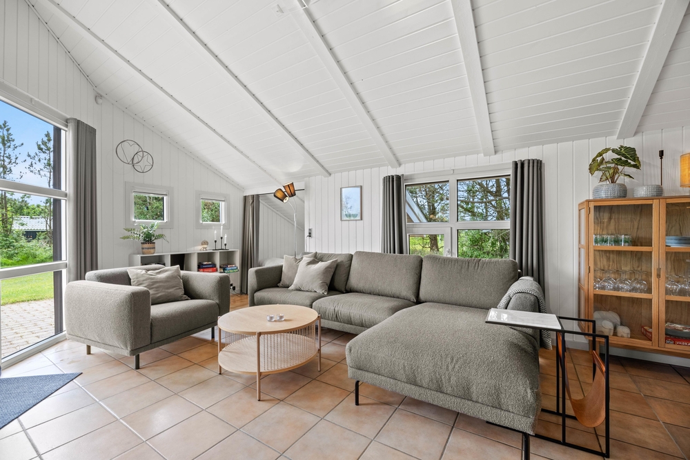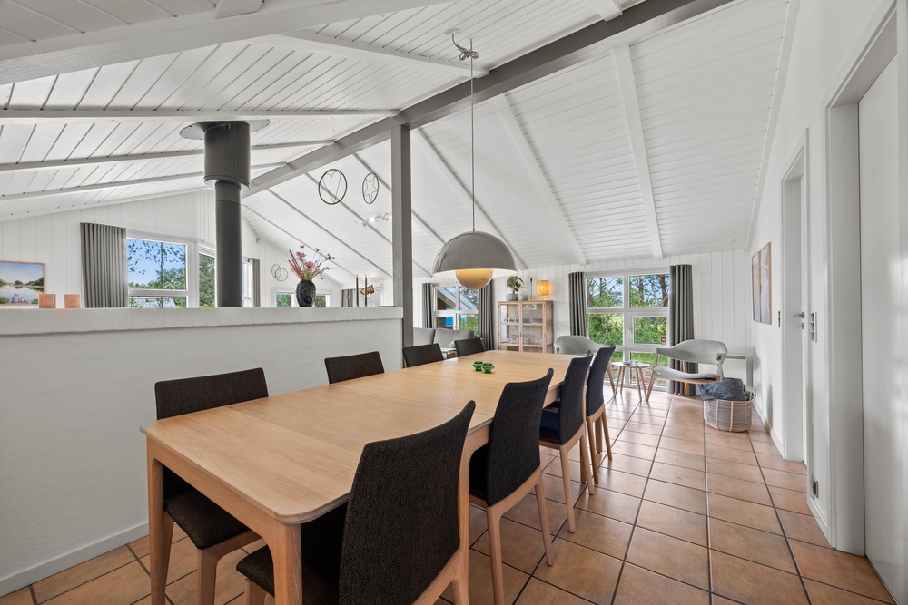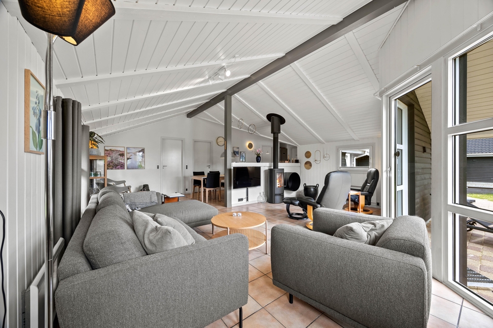 Dieses Ferienhaus wurde im typisch skandinavischen Stil eingerichtet und ist dadurch schön hell und freundlich, strahlt aber zugleich eine gemütliche Atmosphäre aus. Im großzügigen Wohnbereich findet ihr einen Platz zum Entspannen, z. B. auf der gemütlichen Couch, mit einem Glas Wein und dem Knistern des Kamins als Hintergrundmusik. Dank der energiesparenden Wärmepumpe könnt ihr das Ferienhaus aber auch ohne Kamin auf eure Wohlfühltemperatur bringen.