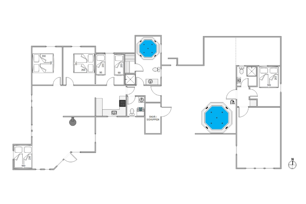Die beiden Bäder sind mit einer Fußbodenheizung ausgestattet und auch ein Gäste-WC findet ihr hier. So könnt ihr euch besser aufteilen und Wartezeiten vermeiden. Im großen Bad liegt, mit Whirlpool und Sauna, eure eigene Wellnessabteilung. Hier könnt ihr euch im warmen Wasser zurücklehnen oder die Wärme der Sauna genießen. Ein idealer Ort, um den Alltagsstress zu vergessen. So entspannt werdet ihr sicherlich gut in den vier gemütlichen Schlafzimmern schlafen und von eurem nächsten Urlaubsabenteuer träumen.