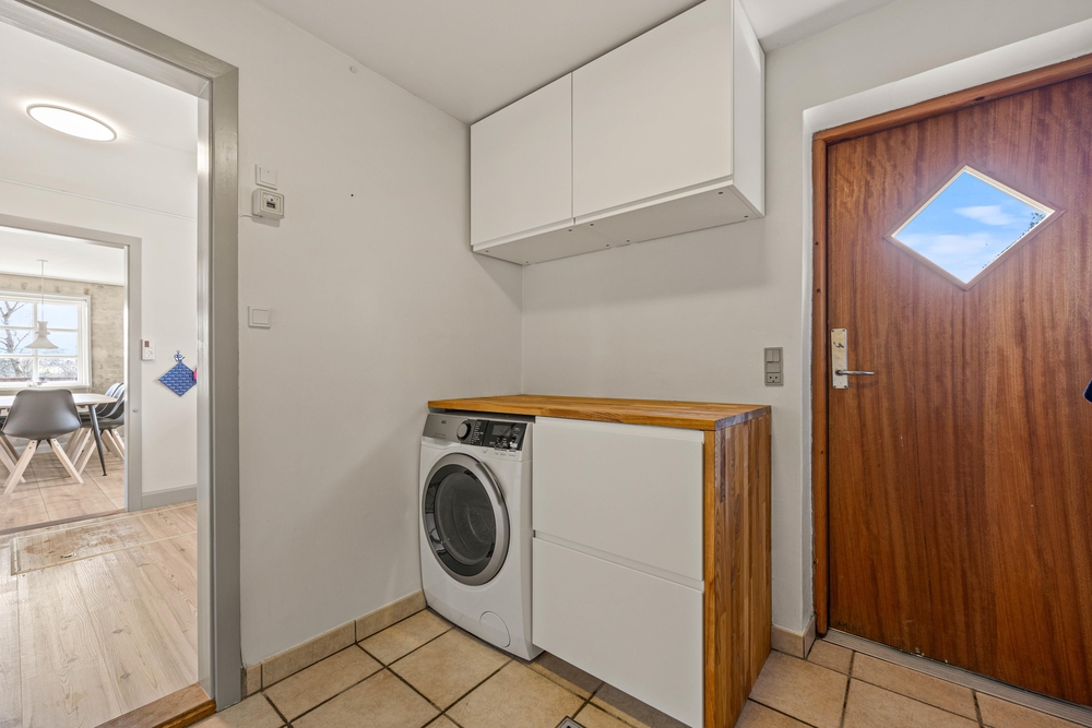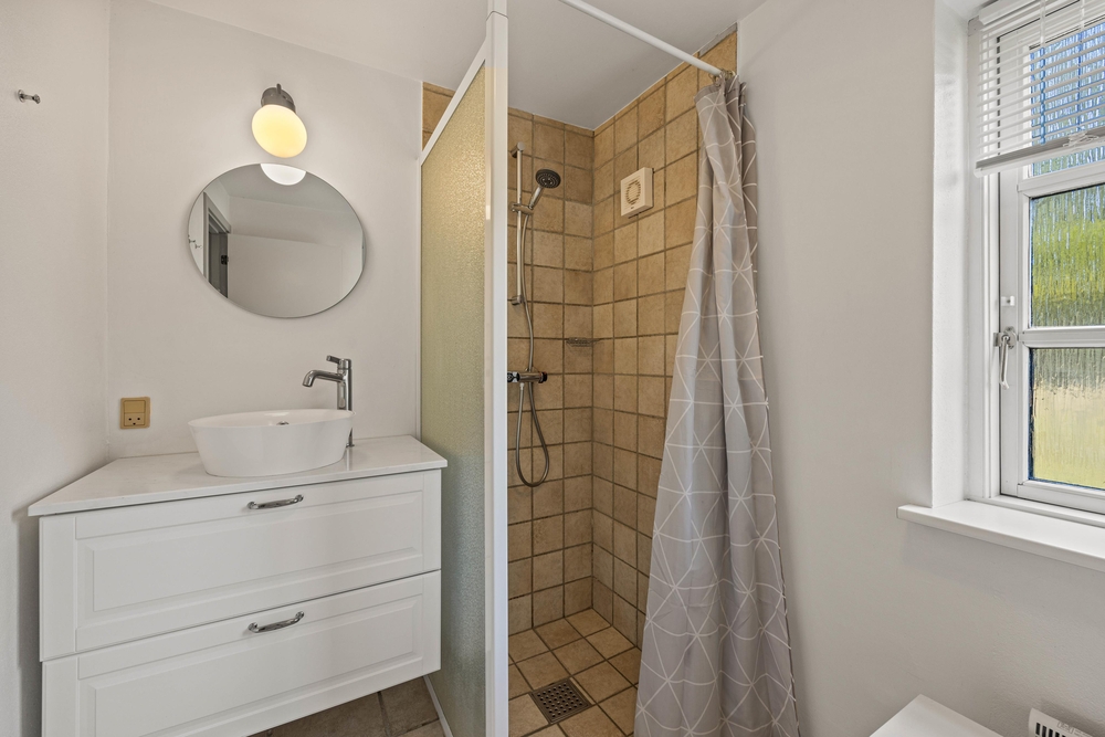 Im Badezimmer gibt es Fußbodenheizung und Waschmaschine, Trockner findet ihr im Eingangsbereich des Ferienhauses.