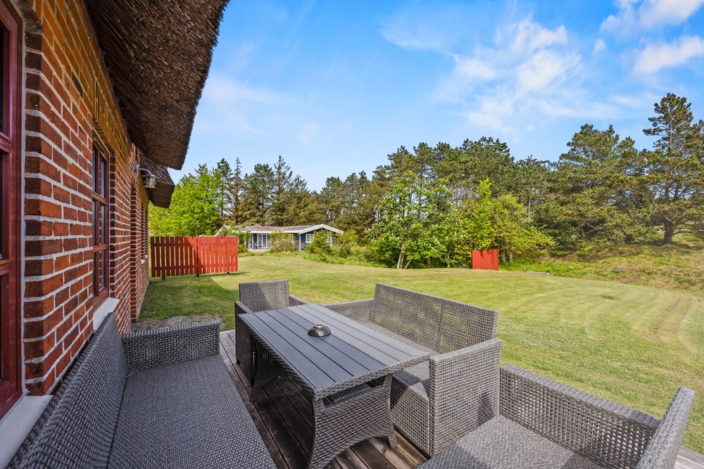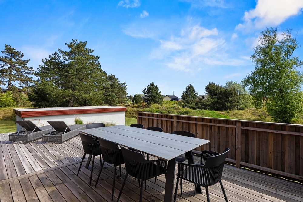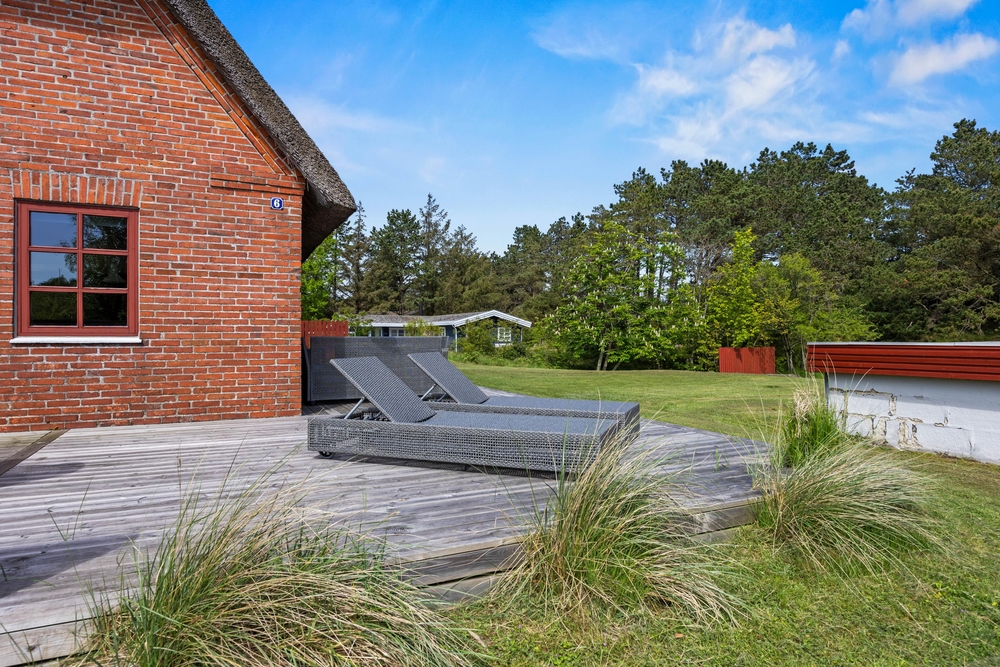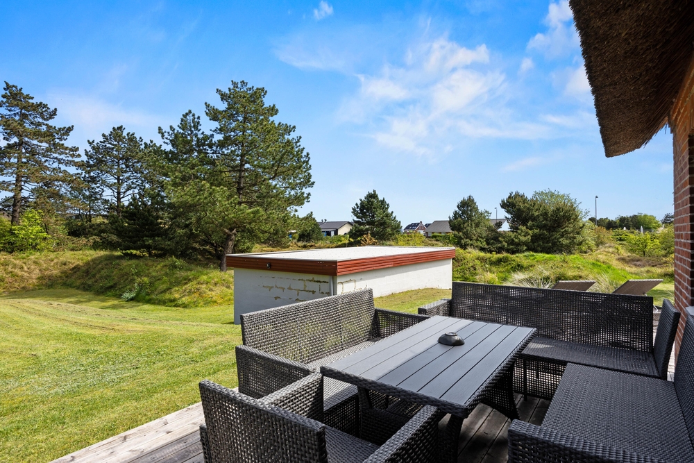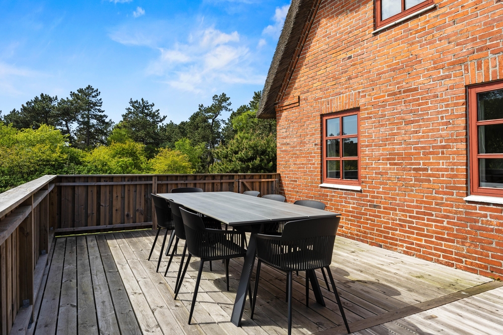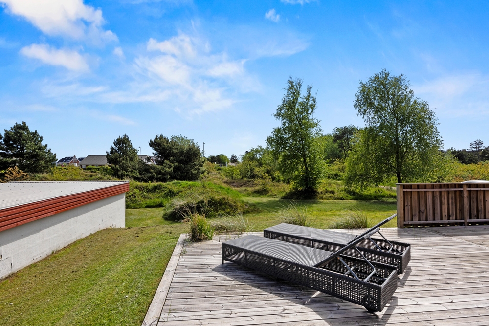 Die Holzterrasse eignet sich bestens, um darauf die Aussicht ins grüne und frische Nordseeluft zu genießen.