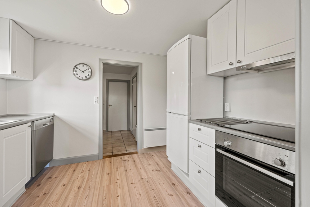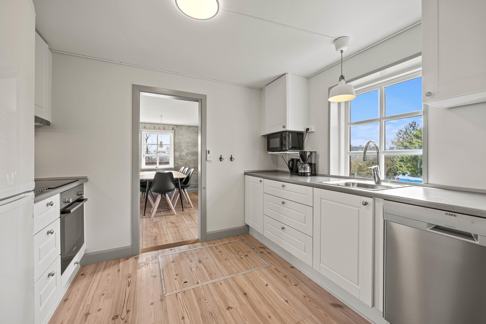 Die schöne Küche enthält alles, was es brauch, um ausgiebig zu kochen. Ein Geschirrspüler übernimmt das Abwaschen, während die ganze Familie am Esstisch das Abendessen genießt.