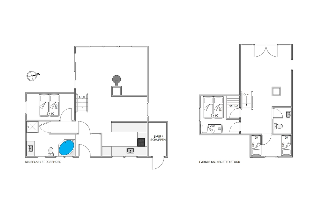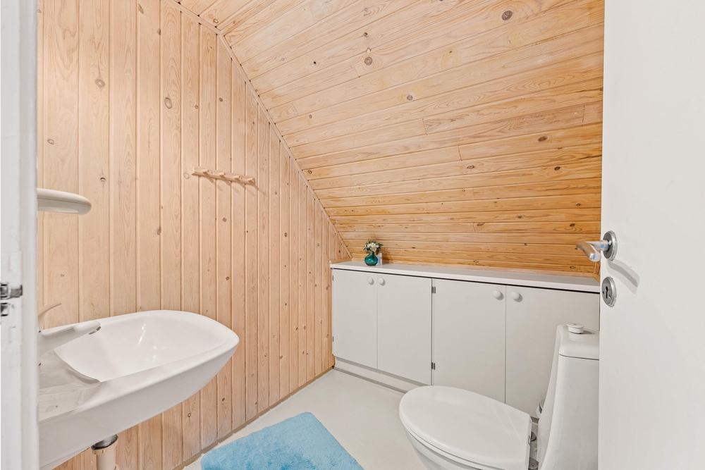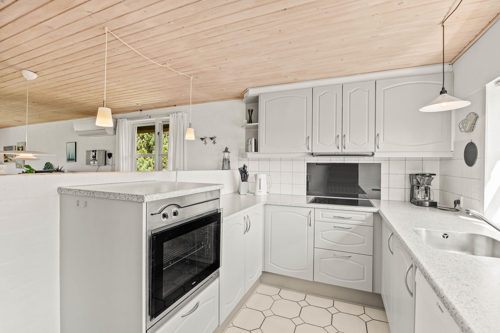 Gemeinsame Ferienstunden verbringt ihr im Erdgeschoss, wo sich der großzügige Wohnbereich mit offener Küche und Essplatz befindet. Mit einem knisternden Feuer im Kaminofen, wird es dann erst so richtig ?hyggelig?. In der Küche könnt ihr gemeinsam das Essen vorbereiten. Lasst euch dabei doch mal von der dänischen Küche inspirieren, und probiert die regionalen Produkte aus, die ihr in den Fachgeschäften in Blåvand bekommt. Im EG gibt es außerdem noch ein Schlafzimmer mit Doppelbett und das große Badezimmer, mit dem herrlichen Whirlpool.