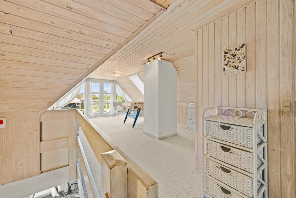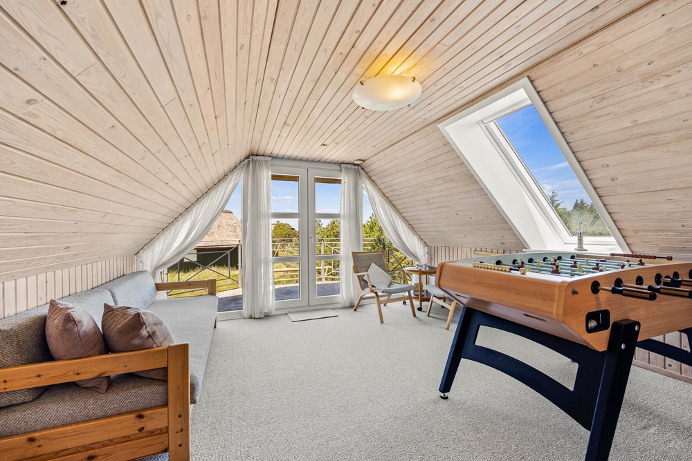 Im Obergeschoss ist es durch die Dachschrägen besonders gemütlich. Ihr habt hier nicht nur einen herrlichen Ausblick auf die Heidelandschaft, sondern könnt hier auch eine Partie Tischfußball spielen oder es euch auch auf dem Sofa bequem machen. Hier findet ihr Ruhe für ein kleines Mittagsschläfchen, wenn nicht eben eine Partie Tischfußball gespielt wird.