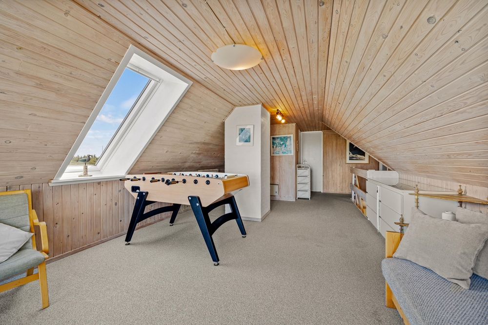 Im Obergeschoss ist es durch die Dachschrägen besonders gemütlich. Ihr habt hier nicht nur einen herrlichen Ausblick auf die Heidelandschaeine Partie Tischfußball spielenft von Blåvand, ihr könnt es euch hier auch auf dem Sofa bequem machen und habt Ruhe für ein kleines Mittagsschläfchen wenn nicht eben eine Partie Tischfußball gespielt wird.