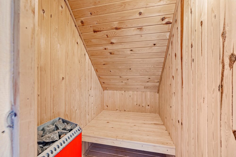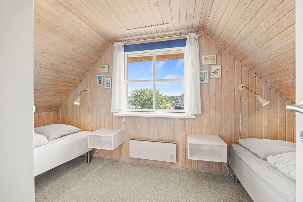 Hier oben gibt es zwei weitere Schlafzimmer mit je 2 Einzelbetten, und 1 Zimmer mit einem Doppelbett und einem Einzelbett, sowie die Sauna und ein WC.