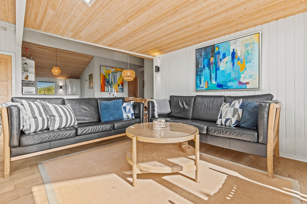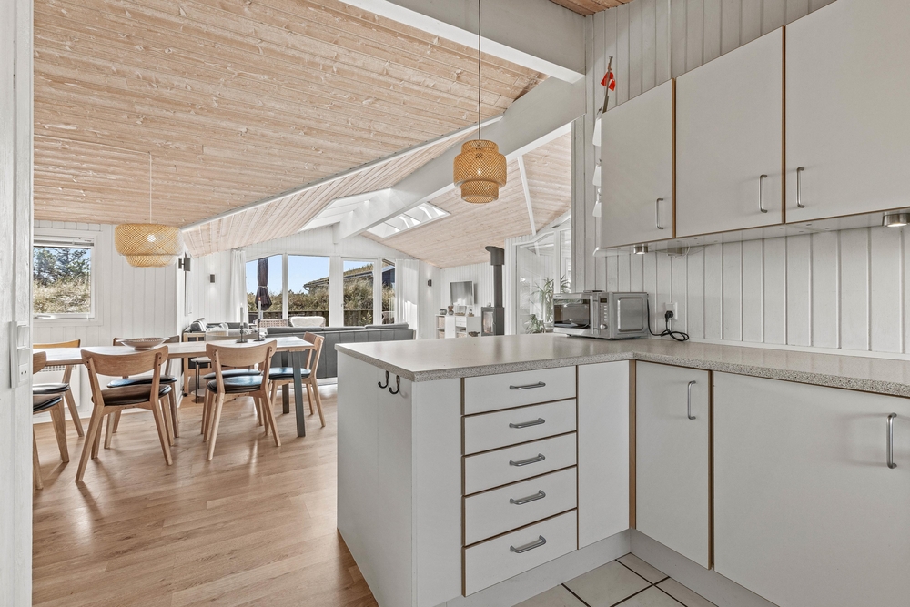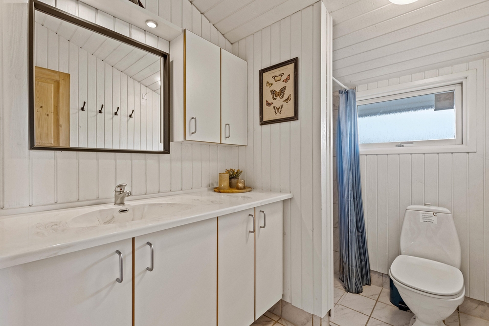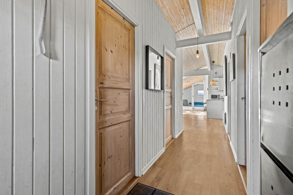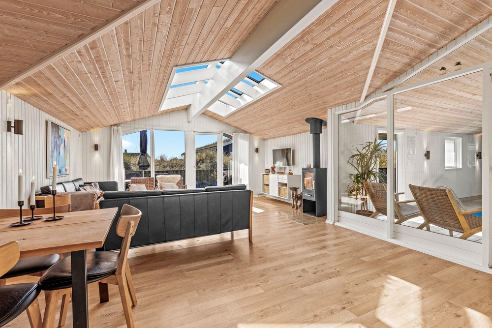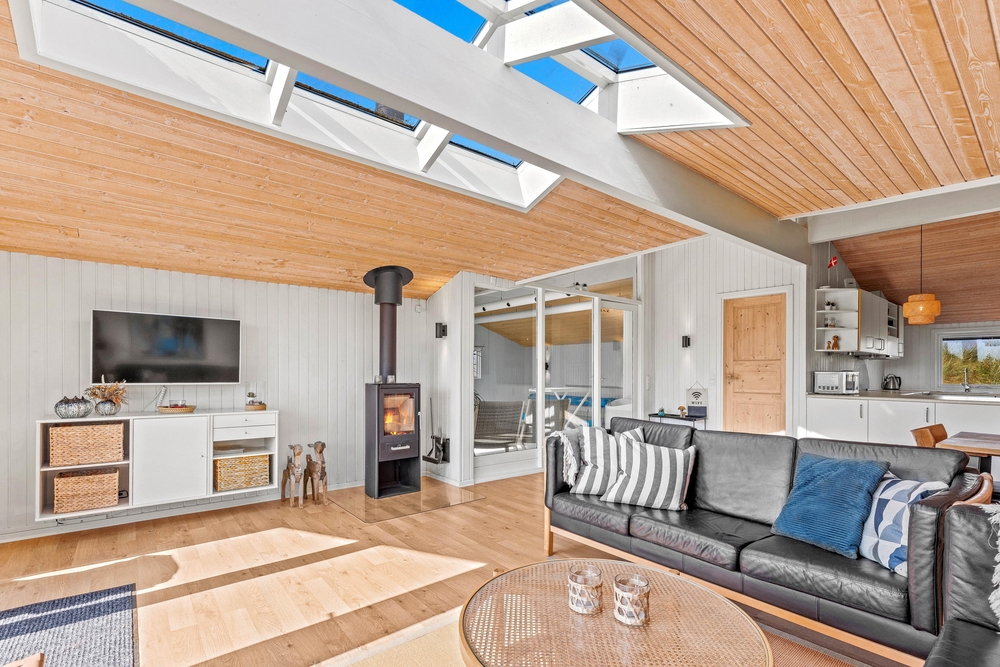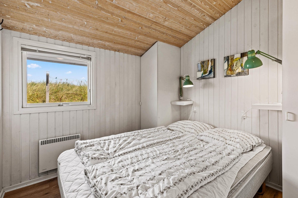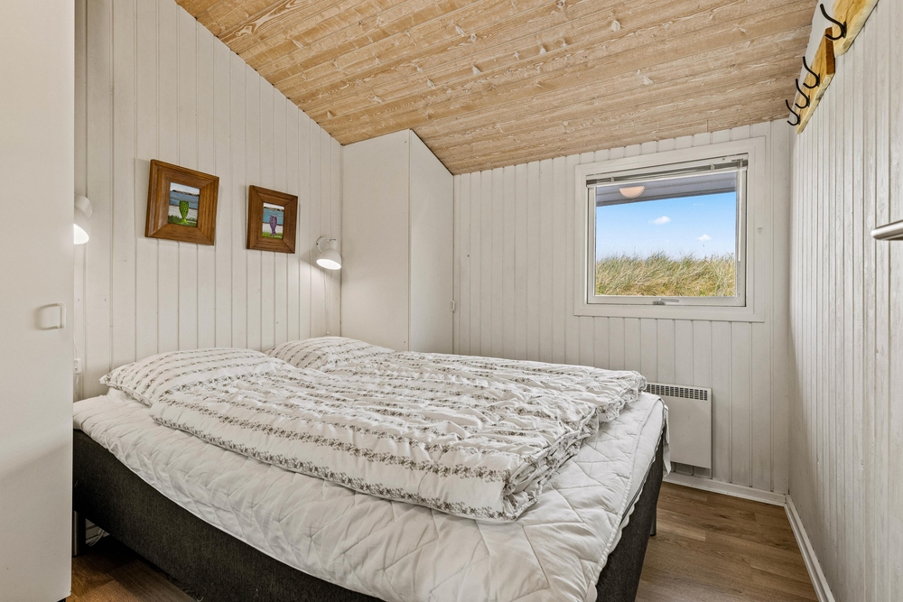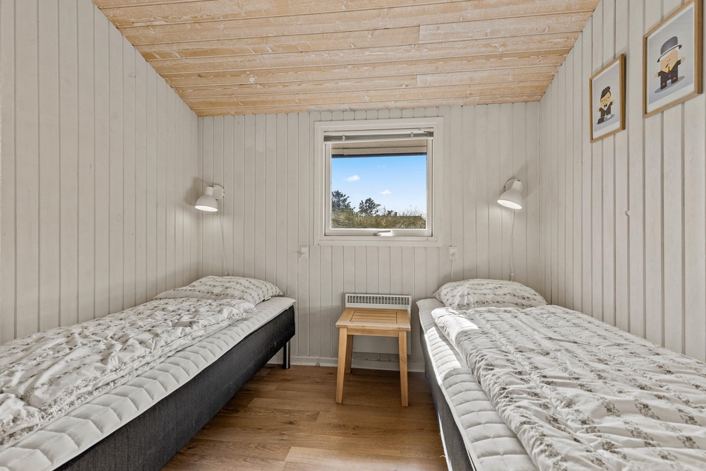 Als nettes Detail verfügt das Wohnzimmer über große Oberlichter, die den Raum hell und freundlich erstrahlen lassen. Die beiden Badezimmer, die mit Fußbodenheizung ausgestattet sind, befinden sich in der Nähe der Schlafräume. Bäder und Schlafräume befinden sich alle am einen Ende des Ferienhauses. Ein Zimmer ist mit einem Doppelbett von 180×200 cm ausgestattet, zwei Zimmer mit 140×200 cm, während das vierte mit 2 Einzelbetten von je 80×200 cm ausgestattet ist. Dieses Ferienhaus ist ein richtiges Familienferienhaus.
