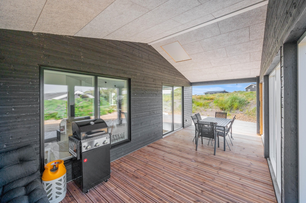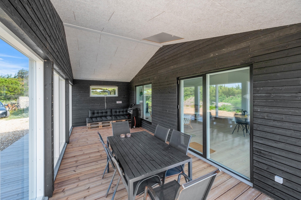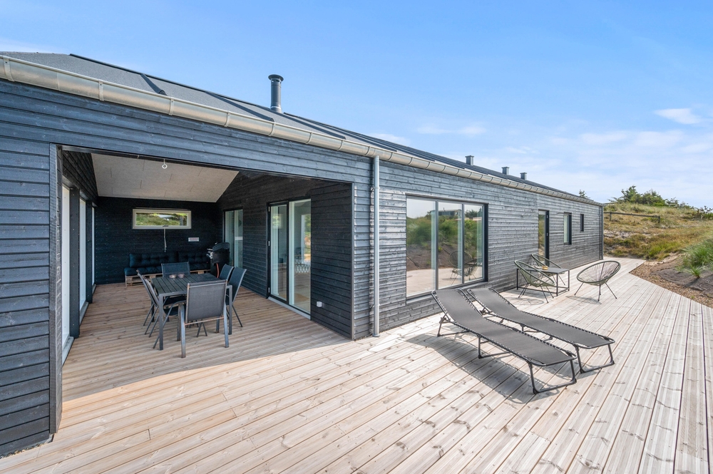 Die große Terrasse, die einmal um das ganze Ferienhaus läuft, wird für Begeisterung bei allen, die in ihrem Urlaub gerne die frische Nordseeluft genießen, auslösen. Der größte Teil der Terrasse ist offen, sodass man die Terrassenmöbel immer so ausrichten kann, dass man jeden einzelnen Sonnenstrahl ausnutzen kann. Es wurde jedoch auch an die unter euch gedacht, die nicht so gerne in der direkten Sonne sitzen möchten oder die, die bei Wind und Wetter die frische Luft genießen wollen, da ein Teil der Terrasse geschützt und überdacht ist.