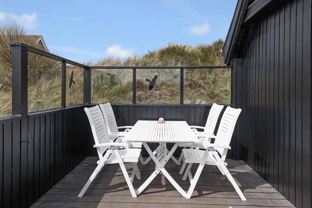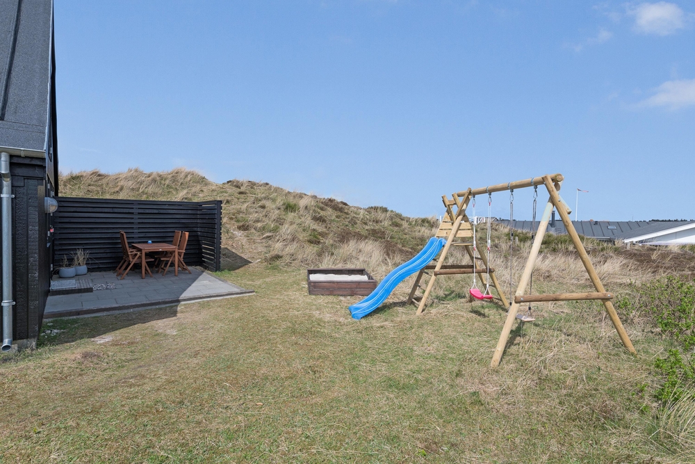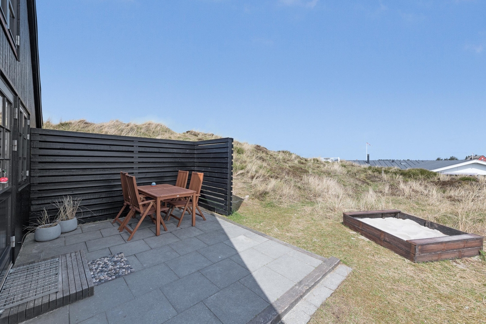 Wind und schlechtes Wetter ist kein Problem im Ternevej 12. Aufgrund der großen, geschlossenen und teilweise überdachten Terrasse findet sich immer ein geschütztes Plätzchen an der frischen Luft. Für Kinder gibt es sowohl Sandkasten und Schaukel, so dass diese sich nicht langweilen, wenn Mama und Papa auf den Liegestühlen ausruhen.