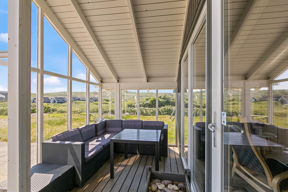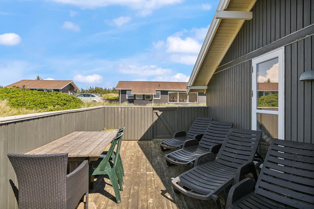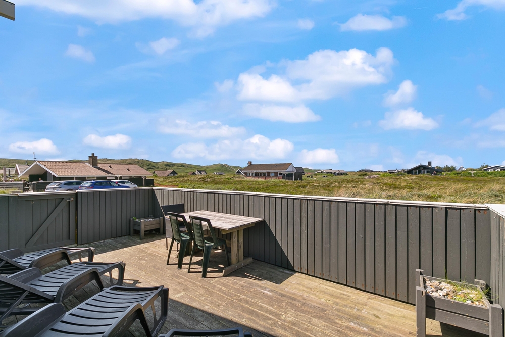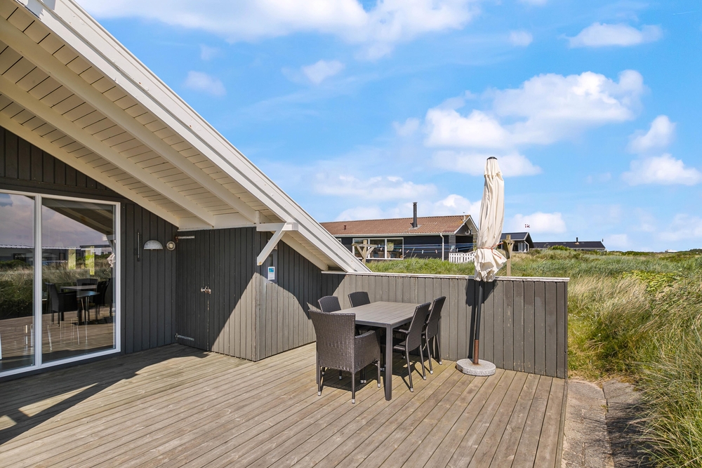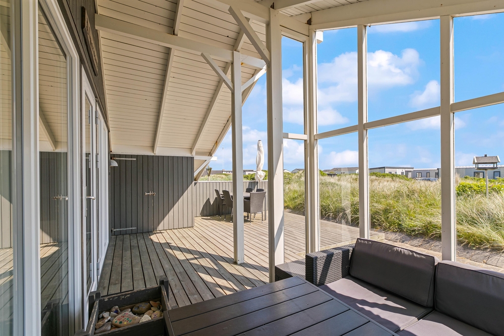 Hier stehen natürlich Gartenmöbel für euch bereit und es ist auch noch ein Grill vorhanden, einem gemütlichen Grillabend mit der Familie steht also nichts mehr im Wege. Da ein Teil der Terrasse abgeschirmt ist, könnt ihr auch bei schlechterem Wetter draußen sitzen und den Ausblick auf die Dünen genießen.