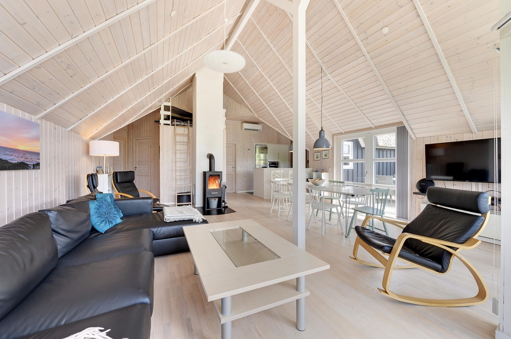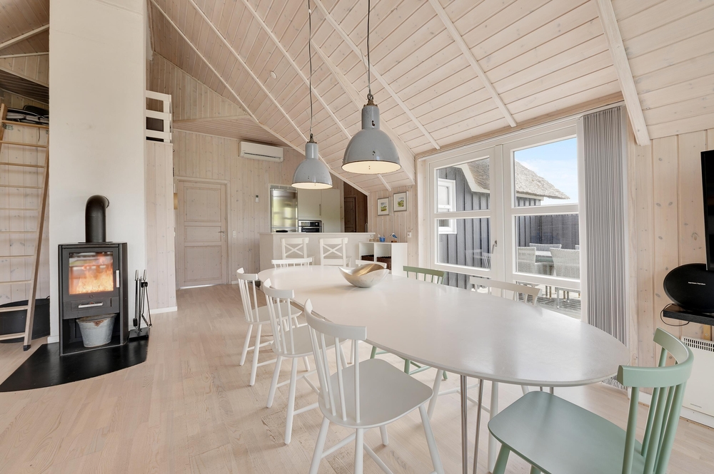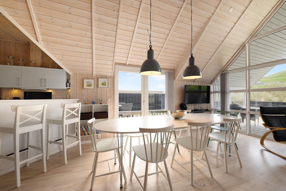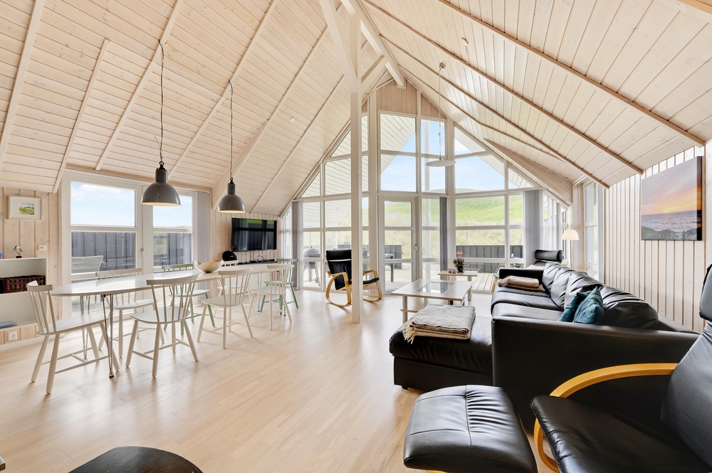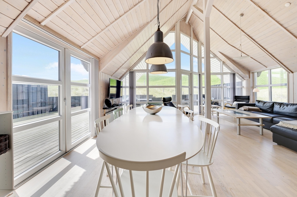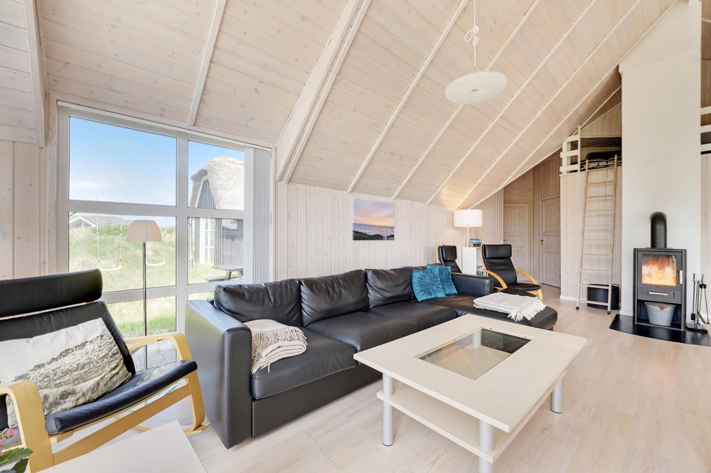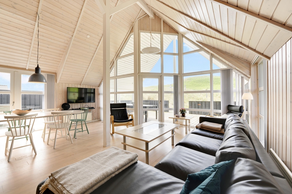 Dieses Ferienhaus ist sehr hell und gemütlich eingerichtet. Durch die große Fensterpartie im Wohnbereich kann man das ganze Jahr über die schöne Aussicht auf die Dünen genießen. Der Wohnbereich ist hell und hat hohe Decken.