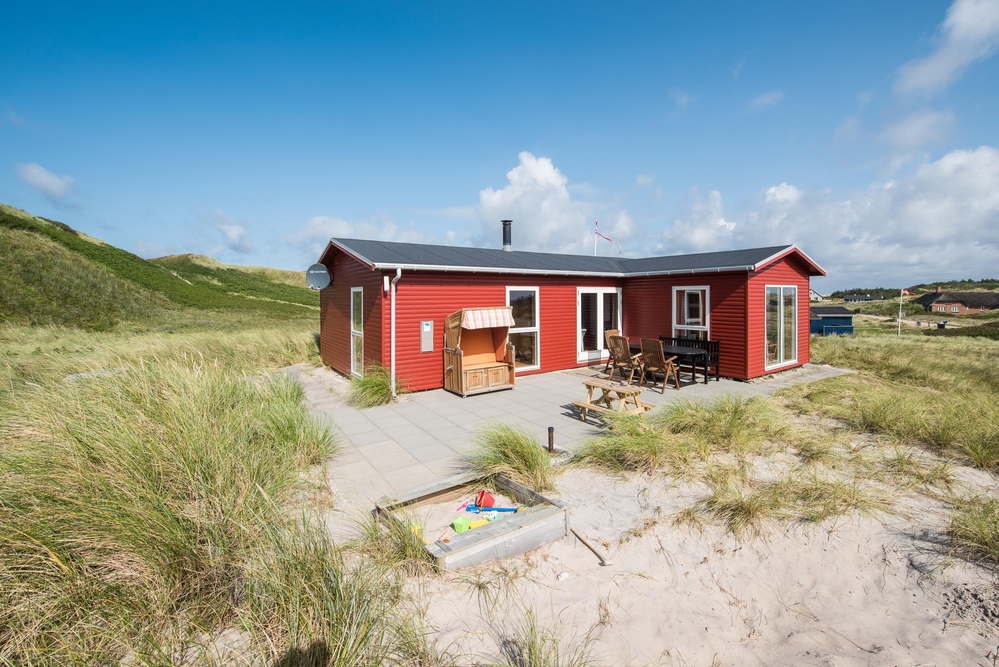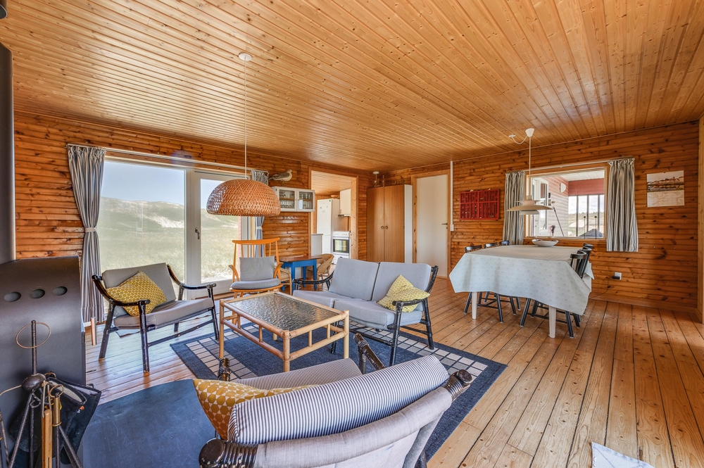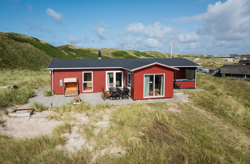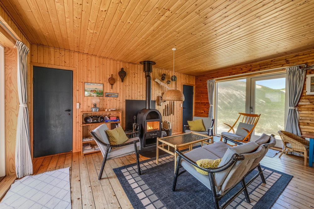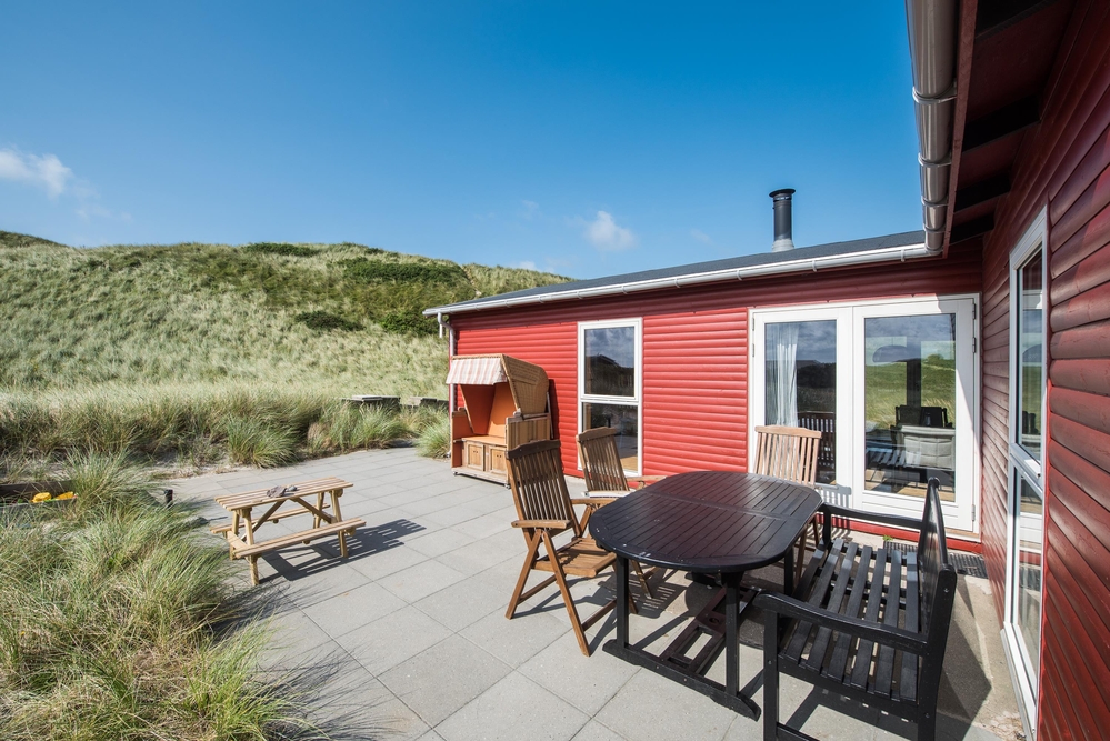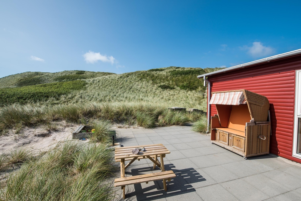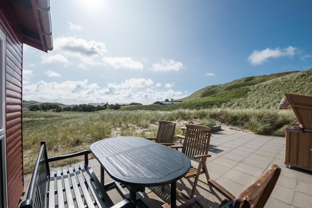 Das Ferienhaus liegt an den Dünen und deswegen hat man im Haus und auf der Terrasse eine wunderschöne Aussicht zu der einzigartigen Dünenlandschaft. Und von hier aus kann man sogar das Rauschen der Nordesee hören.