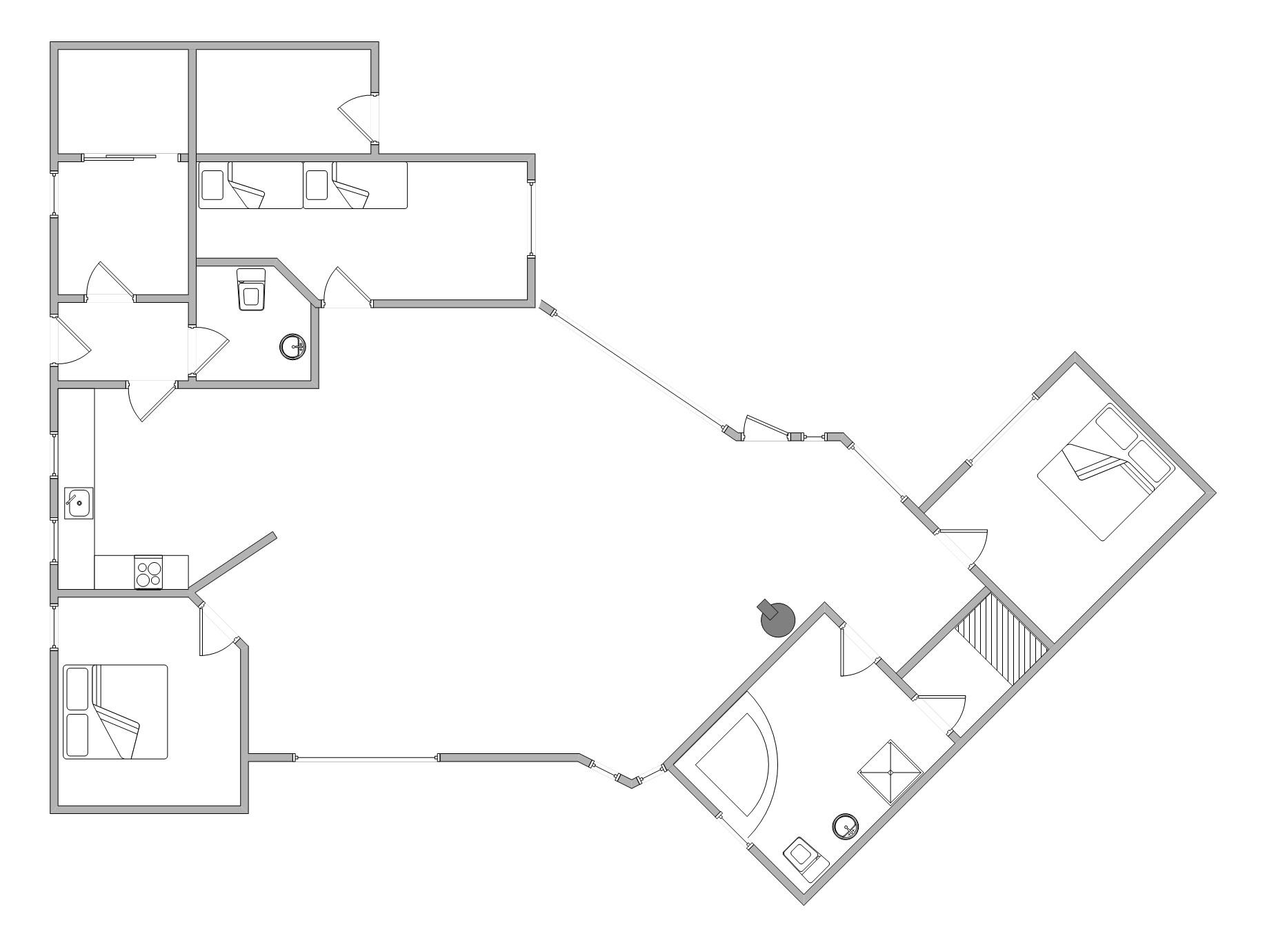 Der Grundriss des Hauses ist L-förmig, was für eine fantastisch schöne Terrasse sowie für eine gute und geräumige Einrichtung sorgt. Die Terrasse ist geschlossen, damit die Kids und der Hund sich dort alleine aufhalten können.