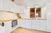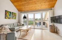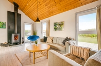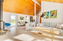Die schöne Küche ist groß und mit Geschirrspüler und Mikrowelle ausgestattet. Der Essbereich ist offen mit der Küche verbunden und diese zwei Räume machen das Herz des Ferienhauses aus. Im Wohnzimmer ist die Holzdecke firsthoch und in diesem Raum stehen Kaminofen und ein Flachbildschirm-TV. Gratis Internet ist inklusive. Eine Wärmepumpe sorgt hier für eine angenehme Temperatur und hält die Energiekosten gering.