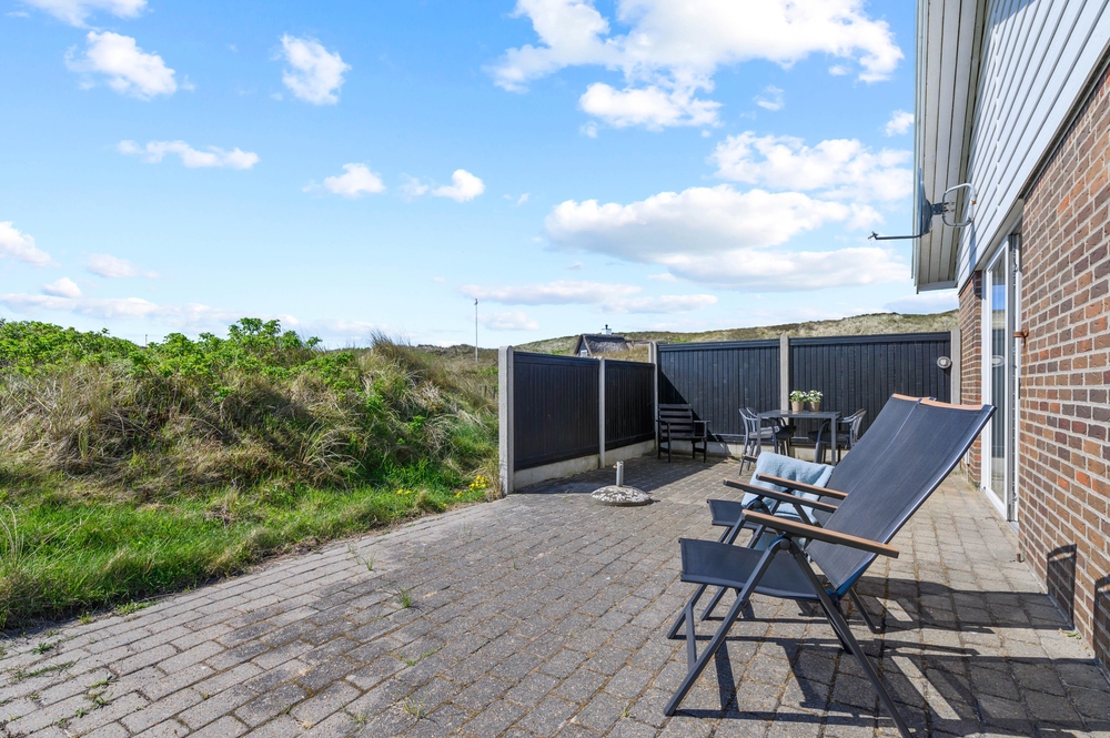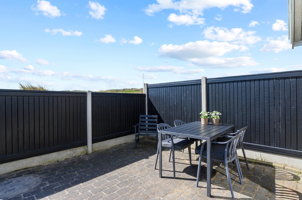 Zu zwei Seiten hat des Ferienhauses befindet sich eine Steinterrasse, wobei eine südwestgewandte Terrasse mit einem Windschutz abgeschirmt ist. Bei blauem Himmel und Sonnenschein könnt ihr das Rauschen der Wellen hören und die frische Seeluft einatmen.