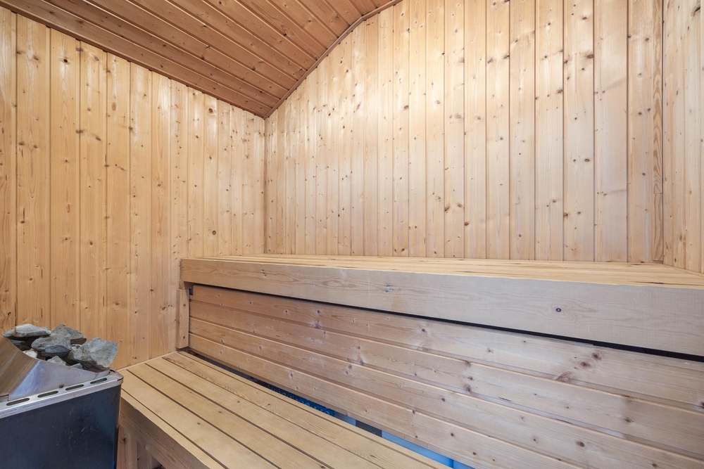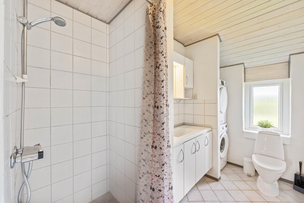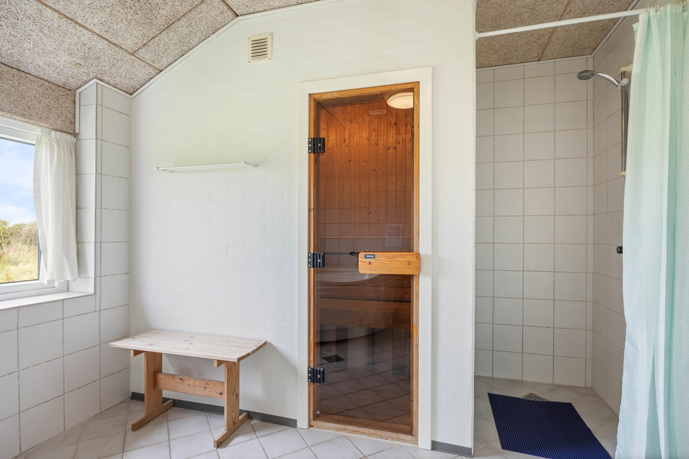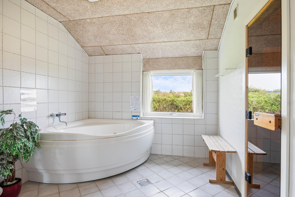 Das Badezimmer ist mit einem Whirlpool und einer Sauna ausgestattet, wo du dich nach einem langen und aktiven Tag an der frischen Nordseeluft richtig entspannen kannst. Im Badezimmer steht auch die Waschmaschine und der Trochner.