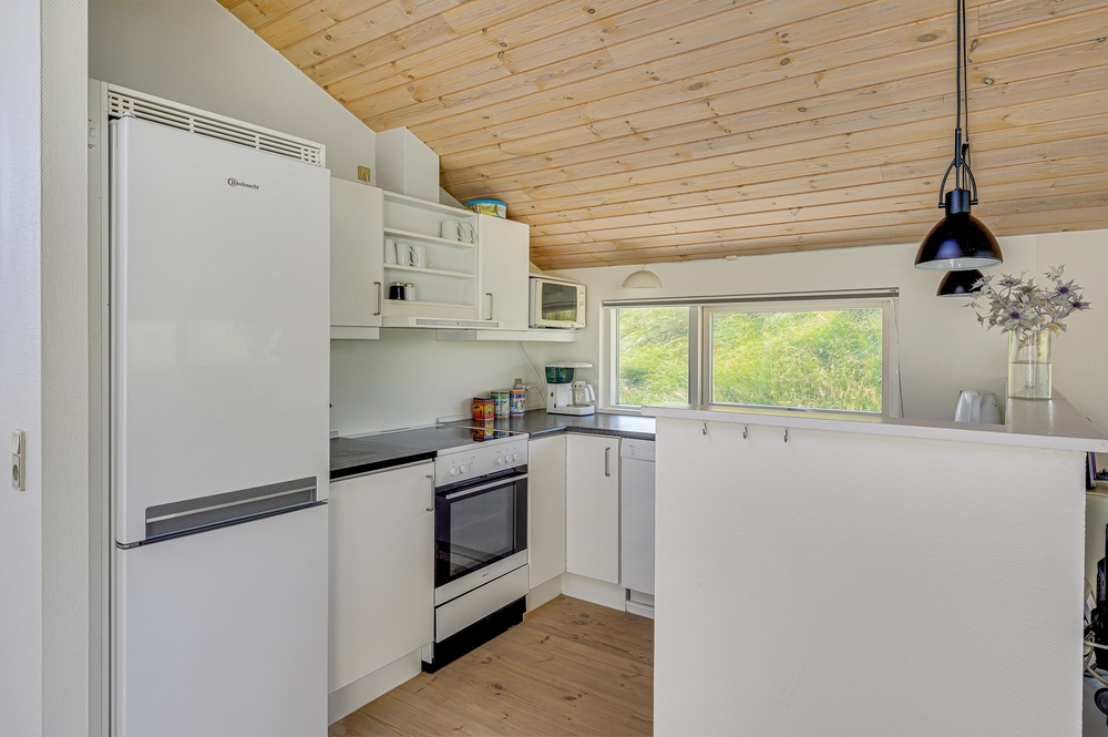 Der zentrale Wohnbereich ist hübsch eingerichtet mit guten und komfortablen Möbeln, Holzofen und Flachbildschirm-TV. Es gibt Holzfußböden überall im Haus. Die Küche ist bestens ausgestattet mit u. a. Geschirrspüler und ist mit dem Ess- und Wohnzimmer offen verbunden. Egal ob Ihr euch im Essbereich befindet oder euch im Sofa erholt, könnt Ihr die schöne Aussicht auf die Natur genießen.