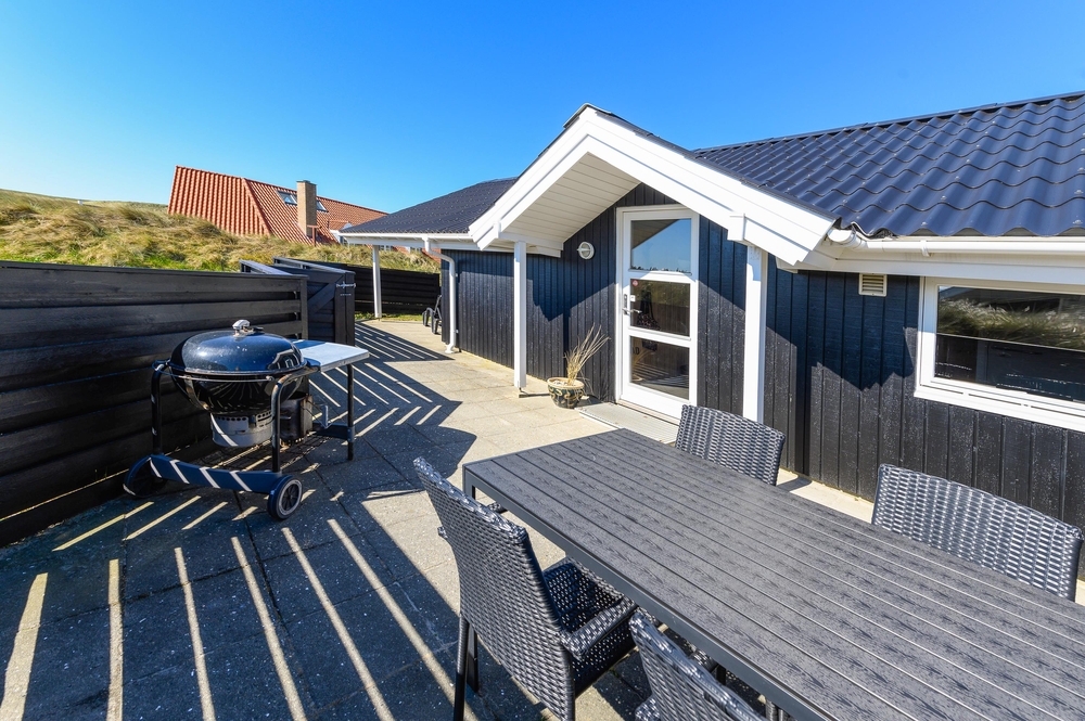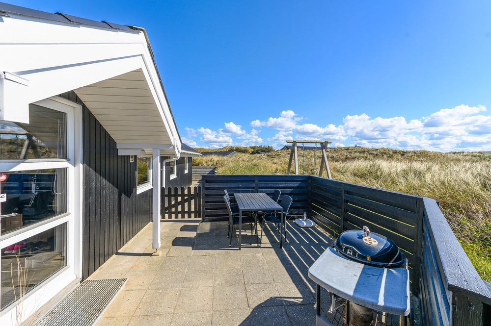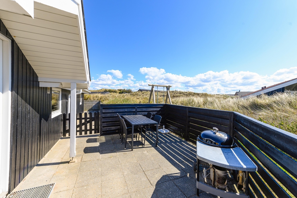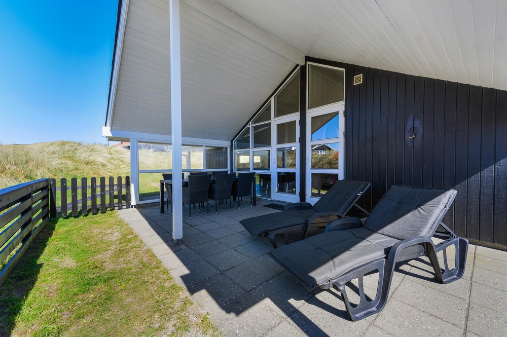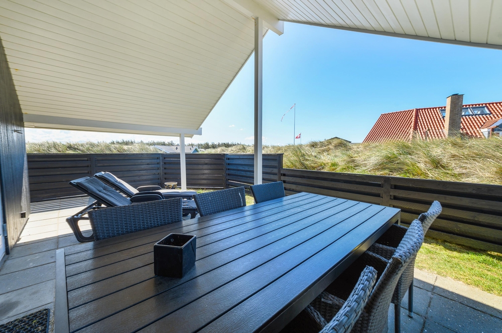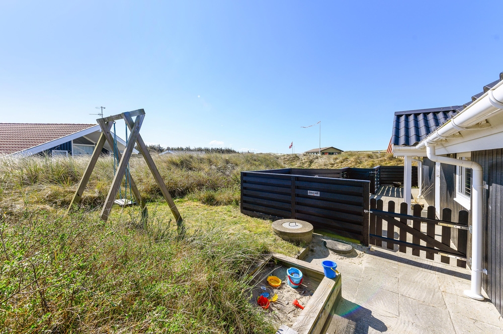 Die Terrasse führt fast um das ganze Haus herum und bietet sowohl eine gute Abschottung als auch einen überdachten Teil plus eine eigene kleine Wiese, wo die Kinder und Hunde sich austoben oder einfach nur relaxen können. Eure Kinder werden von der Schaukel und dem im Jahr 2025 neugebauten Sandkasten begeistert sein. Es stehen hochwertige Gartenmöbel mit Auflagen für euch bereit, so dass ihr bei schönen Wetter euren Aufenthalt nach draussen verlegen könnt. Macht es euch mit einem Buch auf den bequemen Sonnenliegen gemütlich oder geniesst die frische Nordseeluft bei einem Glas Wein oder einer Tasse Kaffee. Eine Düne, welche rund um das Haus liegt, sorgt für zusätzlichen Schutz und erholsame Tage in der Sonne.