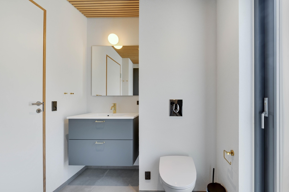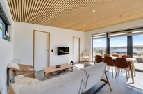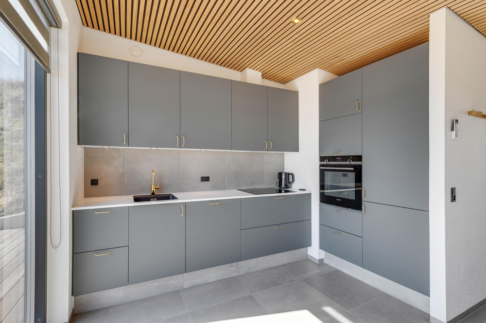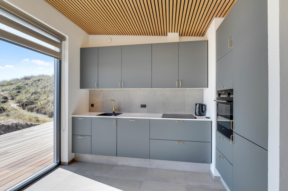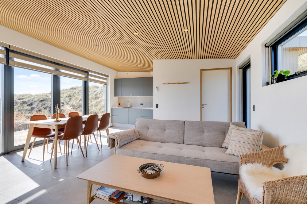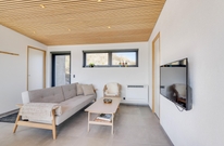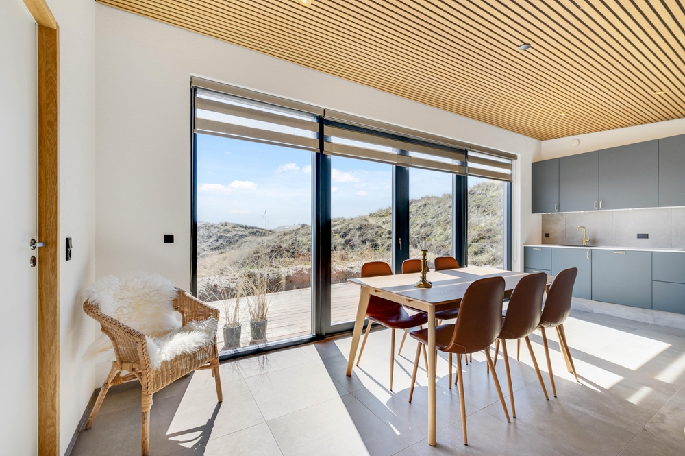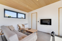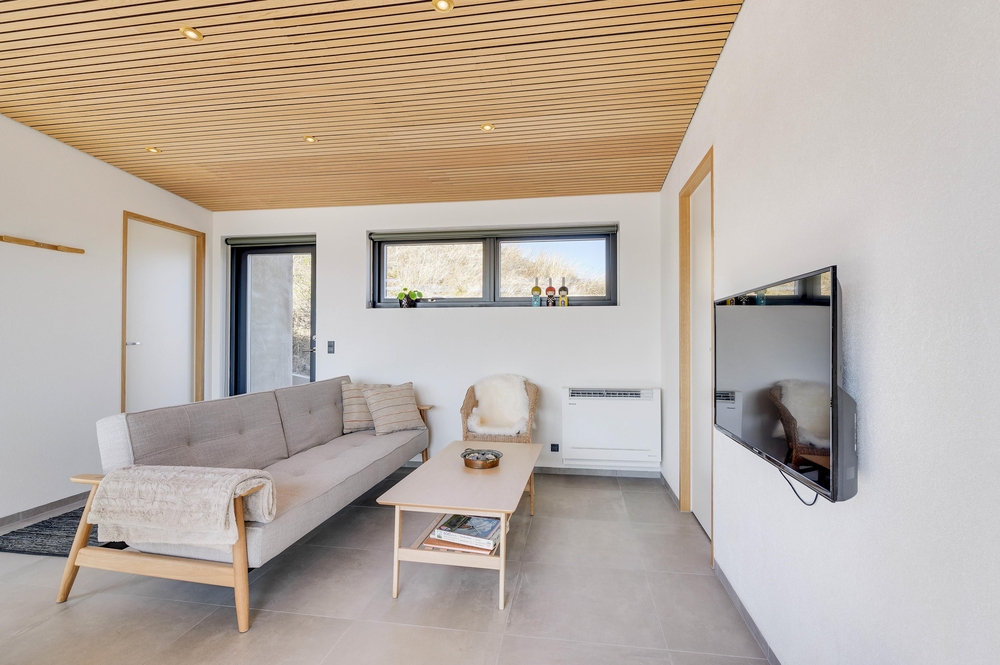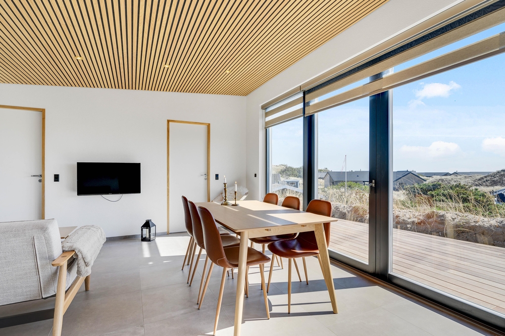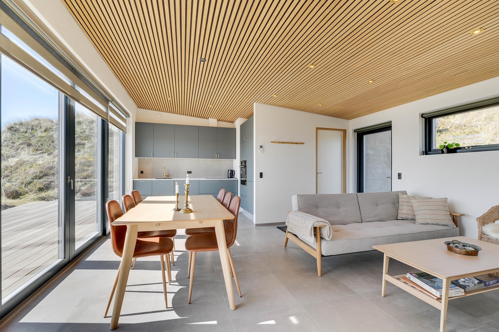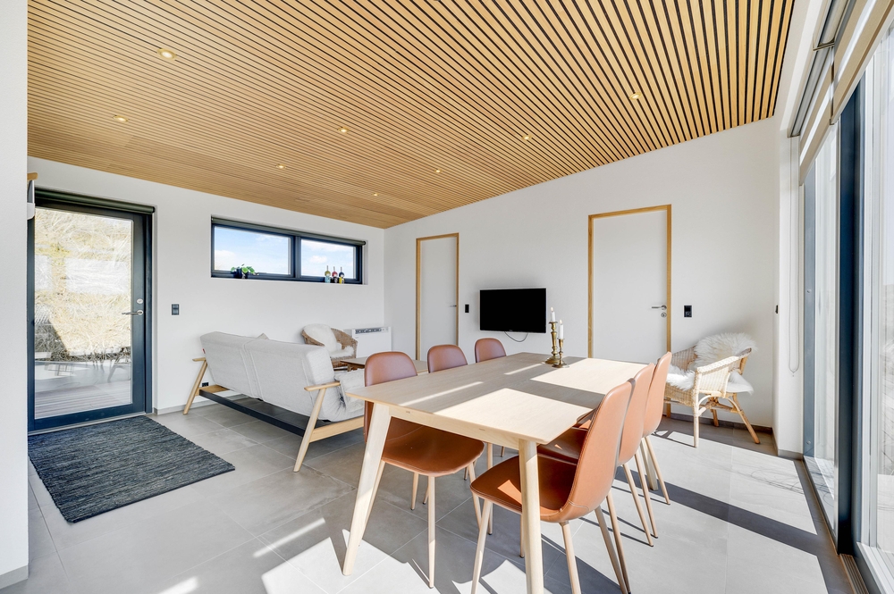 Das Ferienhaus sticht durch seine moderne und stilreine Einrichtung hervor. Vom Flur ist der Eingang in den schönen Wohnbereich, wo moderne Holzdecken und Fliesen, die sich durch das gesamte Haus ziehen, den Rahmen für viele gemeinsame Stunden bieten. Die große Fensterpartie zur südostgewendeten Terrasse geben einen großartigen Lichteinfall, und die Aussicht kann sowohl von Innen als auch draußen genossen werden.