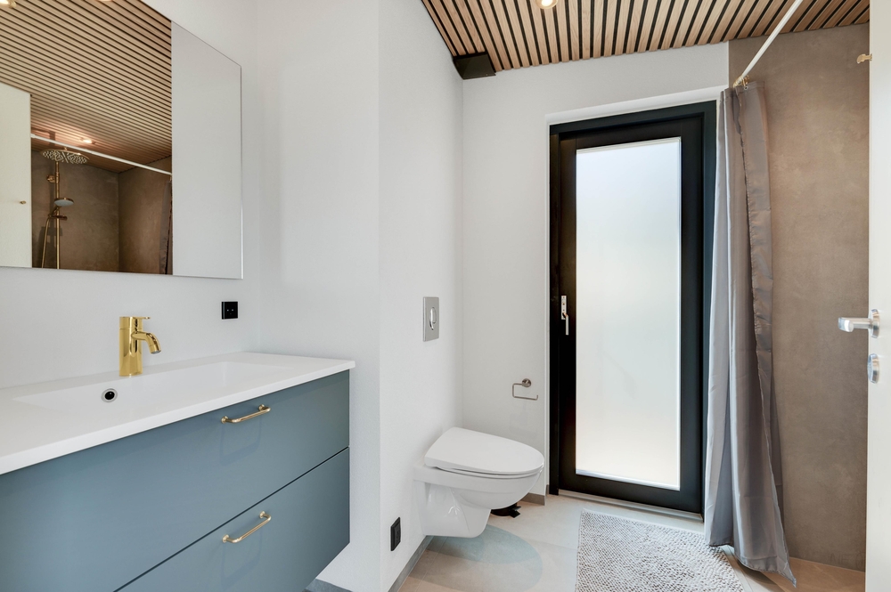 Auch aus dem Badezimmer mit Fußbodenheizung könnt ihr durch das Panoramafenster die Dünenlandschaft genießen, auch aus diesem Raum habt ihr die Möglichkeit rauszugehen.
