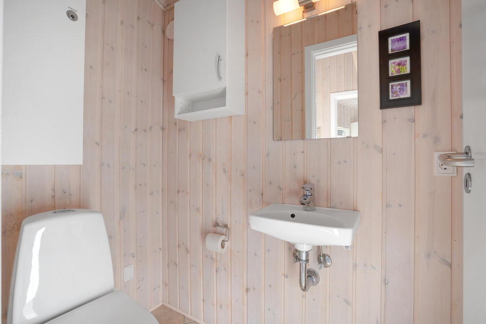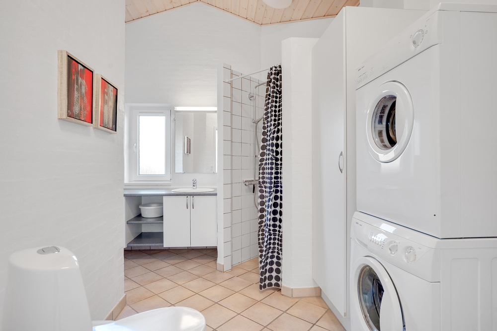 Neben der energiesparenden Wärmepumpe findet ihr auch eine Waschmaschine und einen Trockner im Ferienhaus, was besonders Familien mit Kindern zugutekommt.