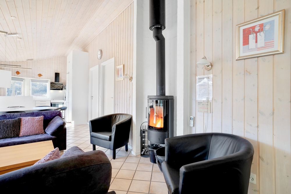 Mittelpunkt des Hauses ist der helle und behagliche Wohnbereich, hier könnt ihr es euch mit einem guten Buch auf dem Sofa bequem machen, während der Kaminofen im Hintergrund knistert.