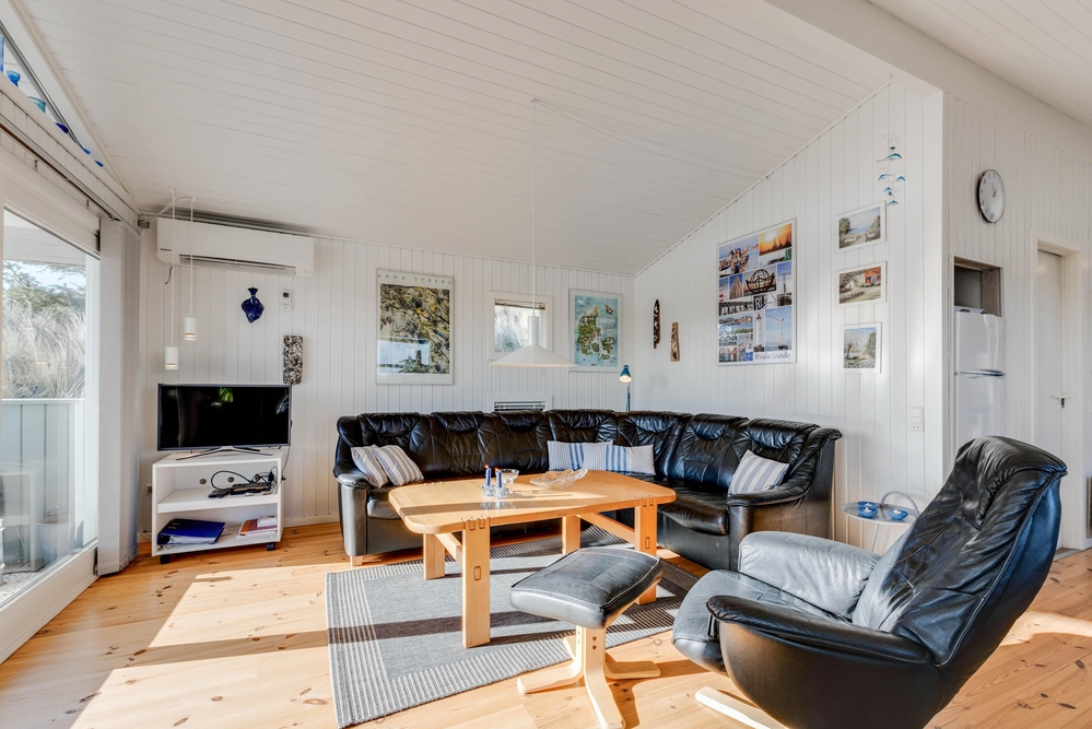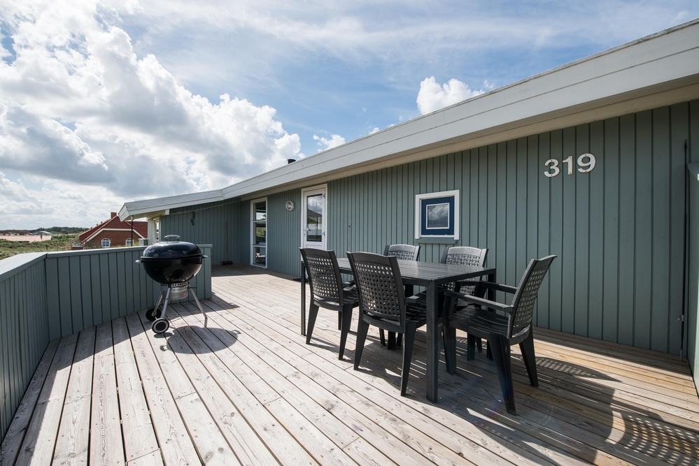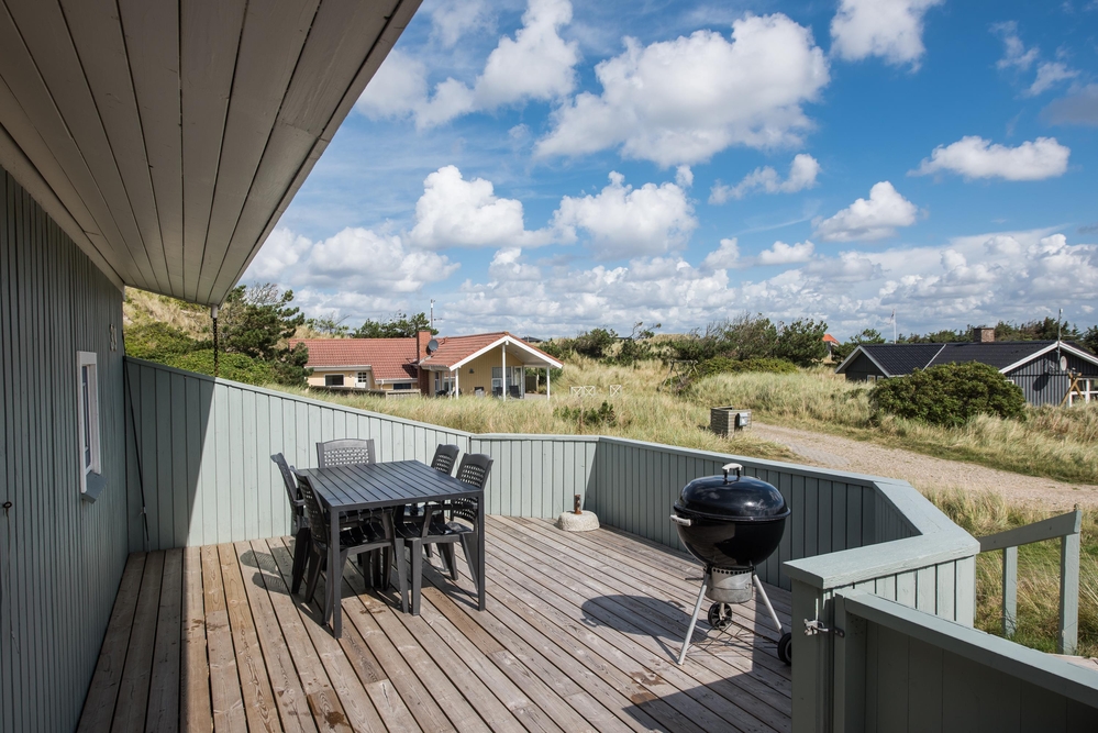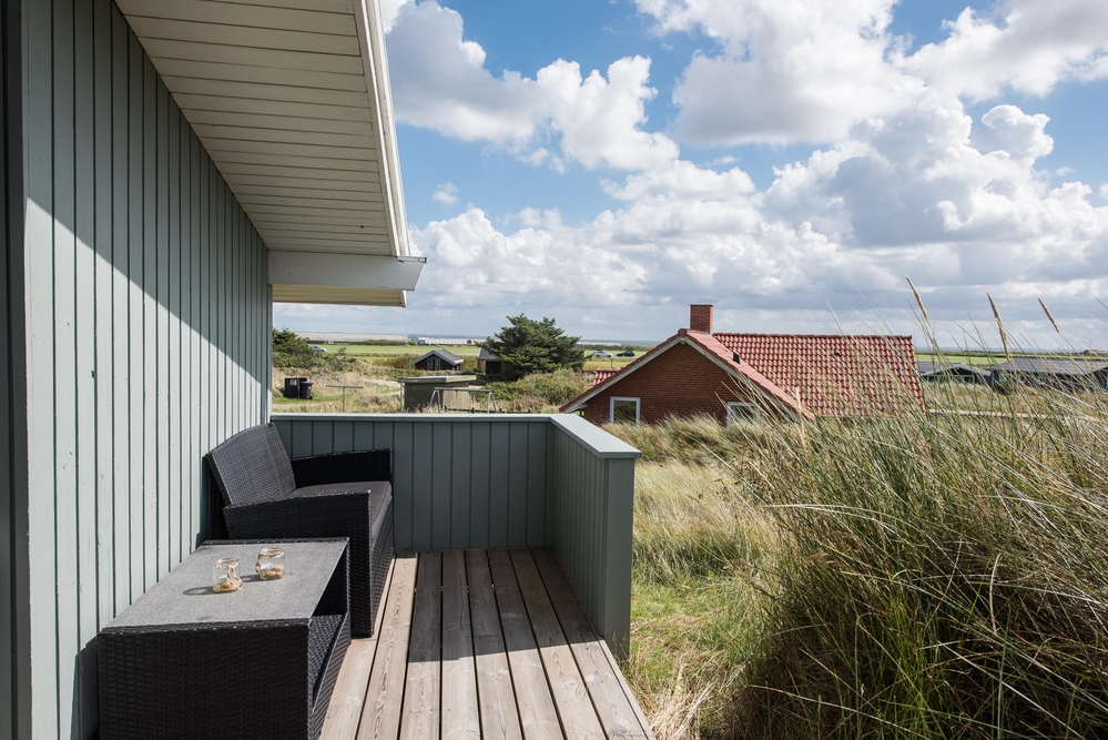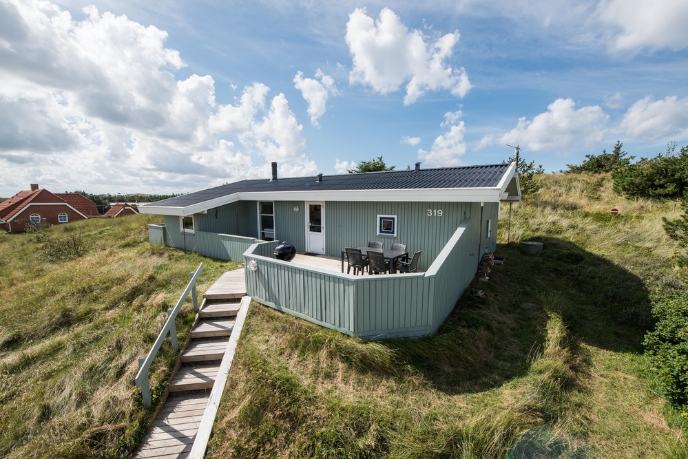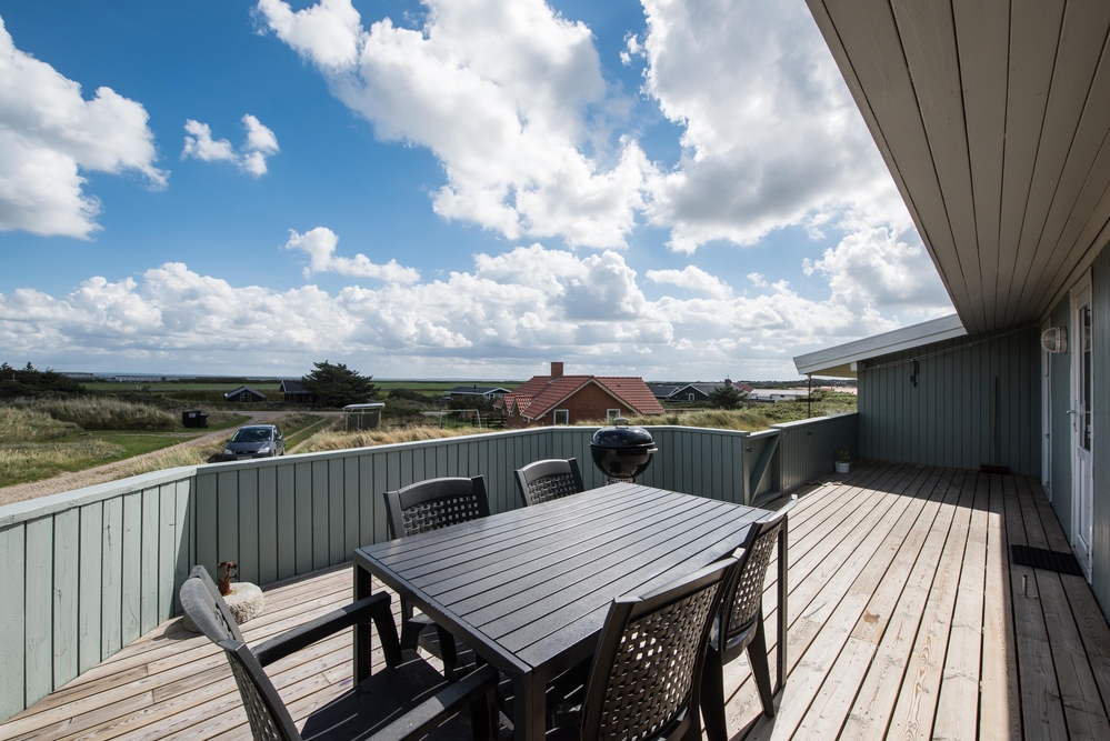 Da das Ferienhaus auf einem erhöhtem Dünengrundstück liegt, habt ihr von hier einen großartigen Blick auf den Fjord und die Landschaft. Und dank der überdachten Terrasse könnt ihr auch bei schlechtem Wetter und Wind draußen sitzen oder abends mit der Familie grillen und den Tag entspannt ausklingen lassen.