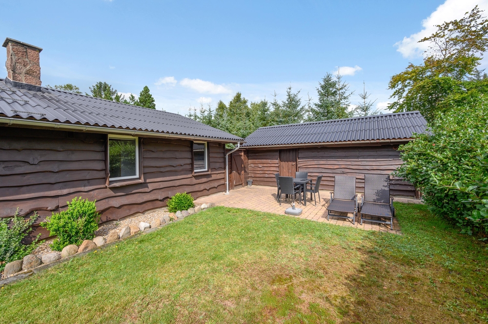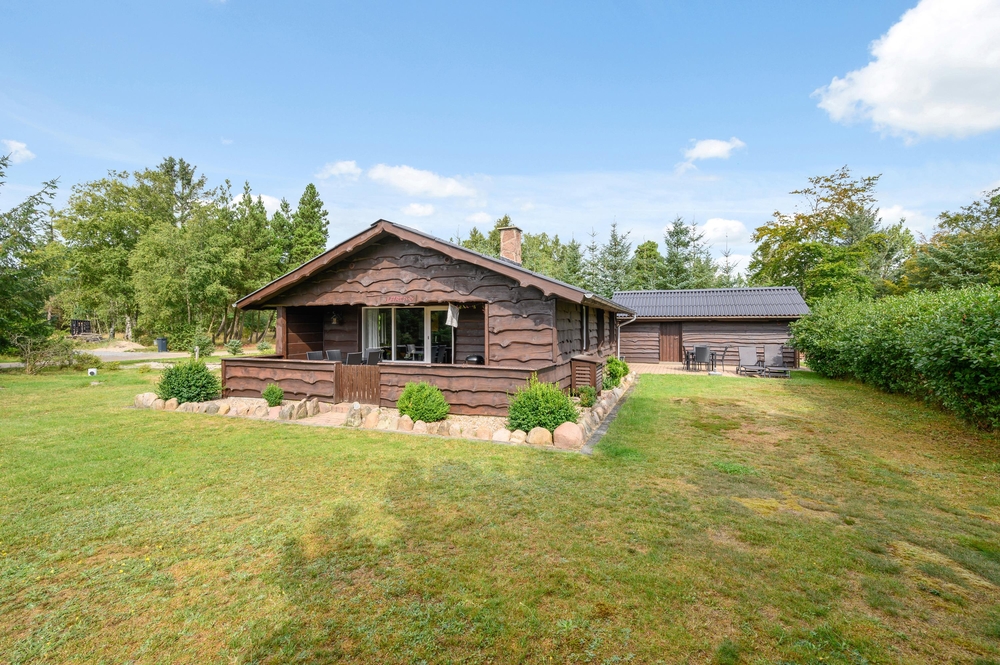 Das kleine Holzhaus überzeugt durch seine rustikale Ausstrahlung und gute Lage auf einem großen, von Bäumen und Büschen umsäumten Grundstück.