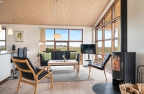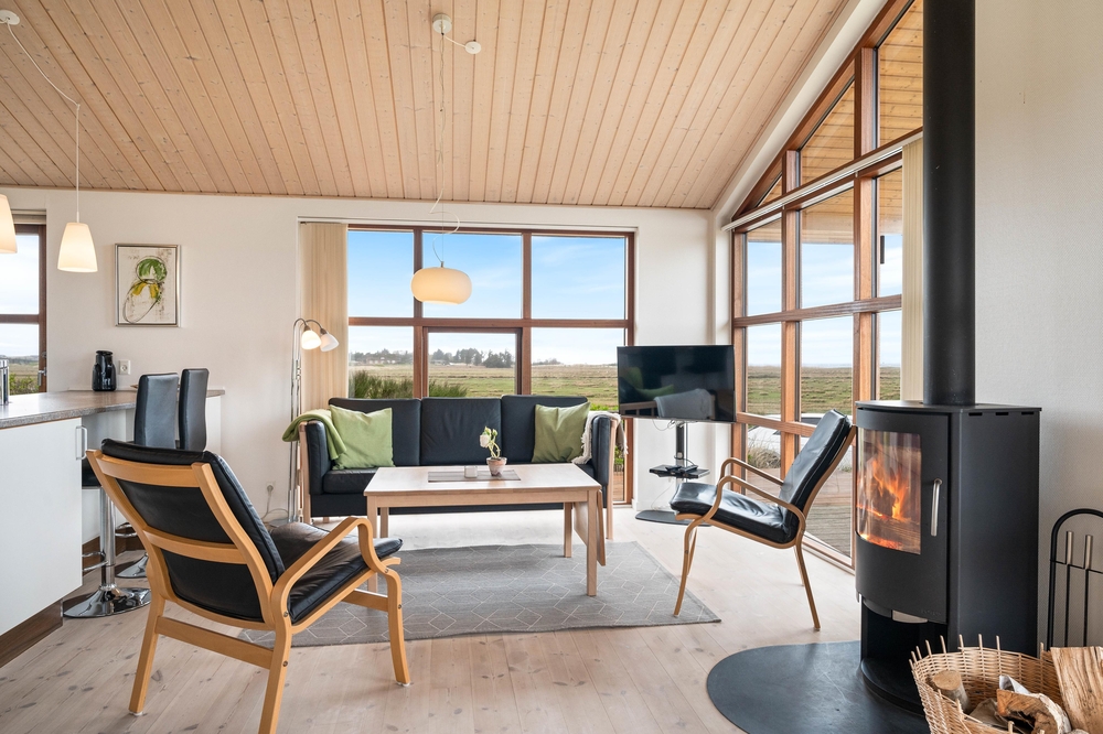 Das Herzstück dieses Ferienhauses ist aber mit Sicherheit der großzügige Wohnraum, mit seinen hohen, hellen Holzdecken und zahlreichen Bodentiefen Fenstern, die viel natürliches Licht hereinlassen. Kuschelt euch auf die bequemen Sessel vorm Kamin und genießt die Panoramaaussicht. Dazu noch einen warmen Kakao und ein leckeres Stück Kuchen und die hyggelige Stimmung ist perfekt.
