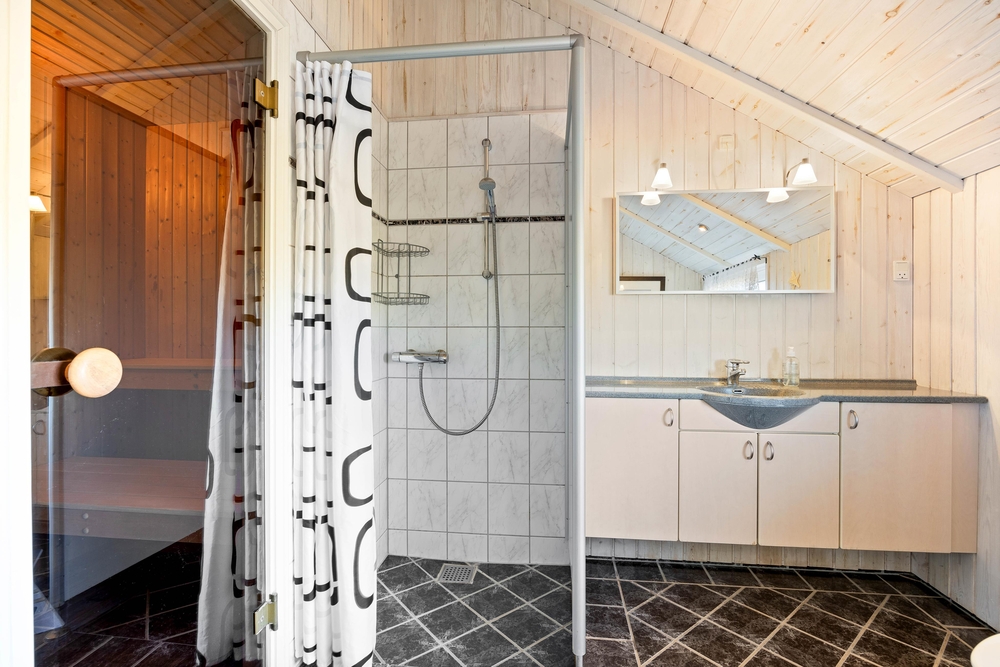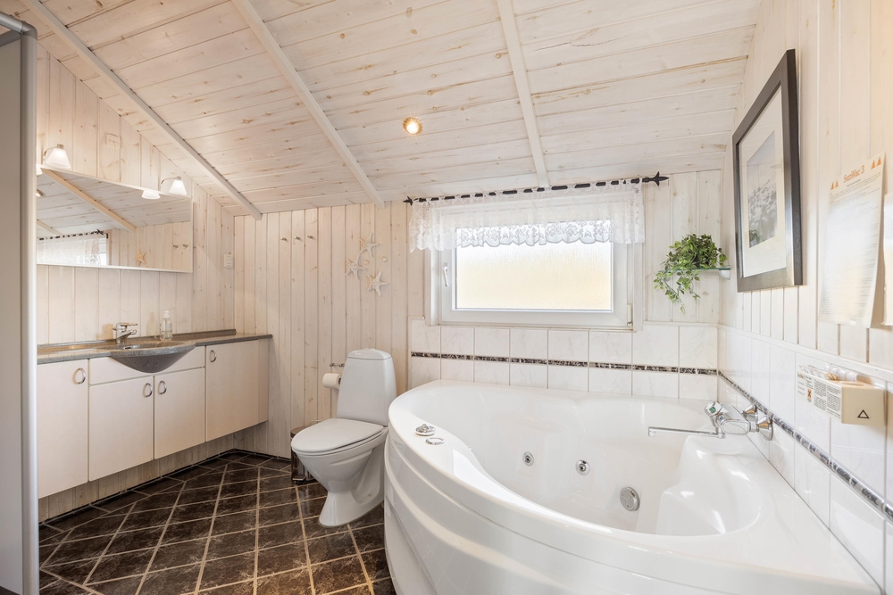 Die beiden Bäder sind mit Dusche und Fußbodenheizung ausgestattet. Im größeren Bad findet ihr den Whirlpool und den Zugang zur Sauna vor. Genießt ausgiebige Saunagänge und lange Bäder im warmen Wasser. Hier könnt ihr die Seele baumeln lassen. So entspannt könnt ihr bestimmt gut schlafen. Es gibt in diesem Ferienhaus zwei gemütliche Doppelbettzimmer und eines mit einem Doppel- und einem Einzelbett.