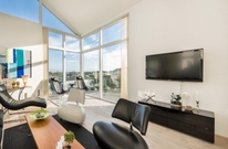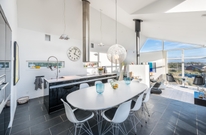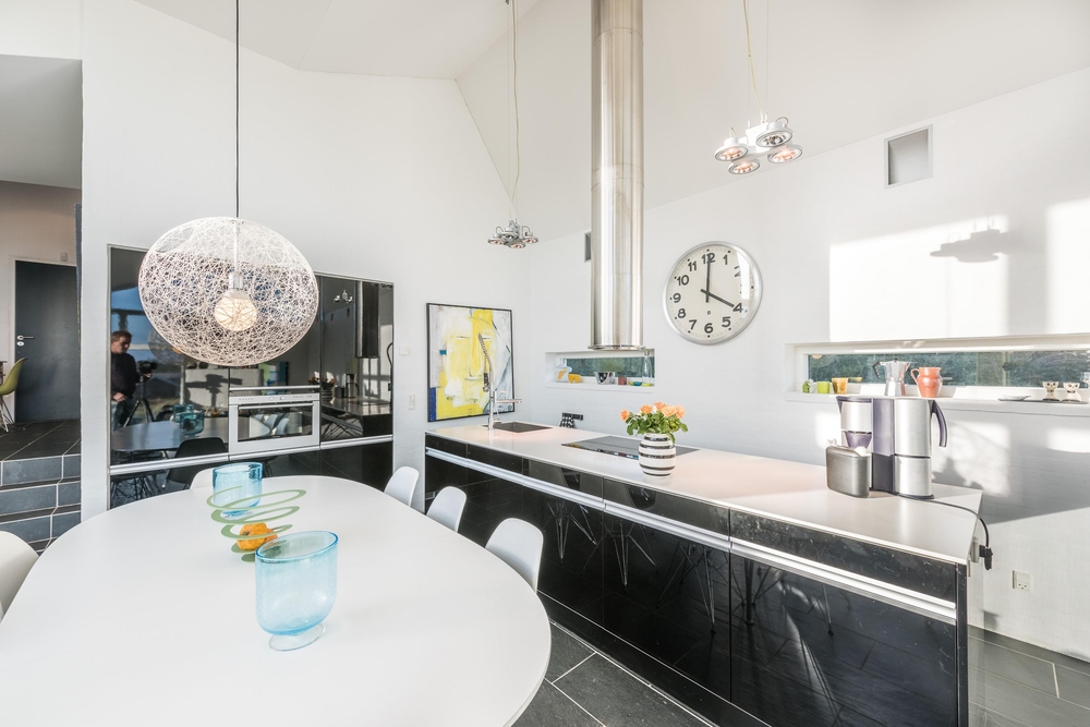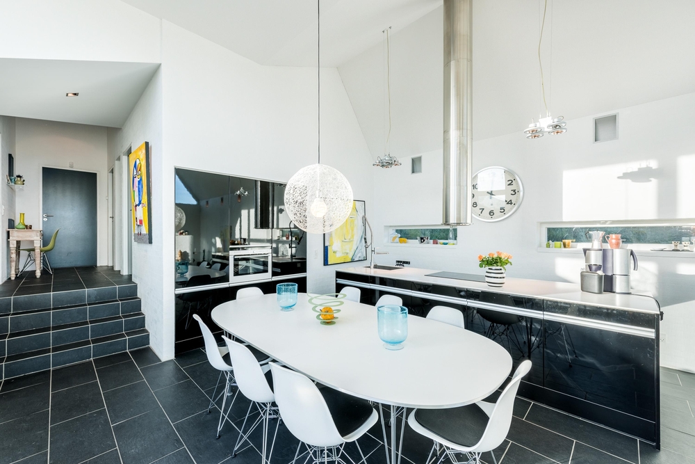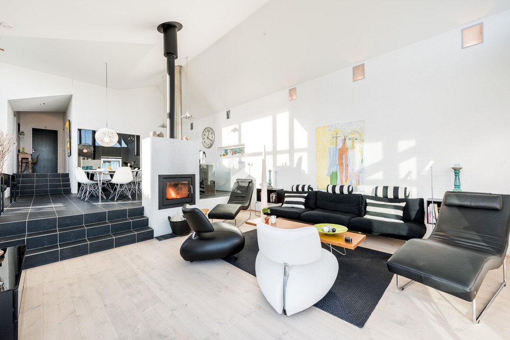 Der gesengte Wohnbereich mit Designermöbeln lädt zum Entspannen vor dem Kamin oder dem Smart TV ein. Da die Küche offen gestaltet wurde, kannst du auch während des Kochens am Familienleben teilhaben.