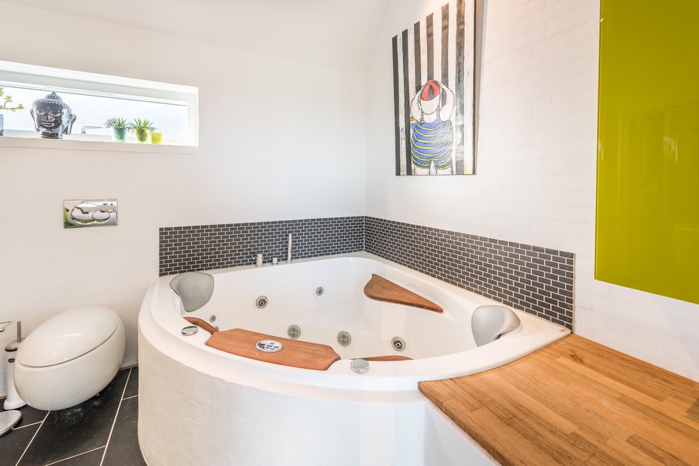 Natürlich ist in diesem Ferienhaus auch ein Whirlpool vorhanden, in dem ihr euch nach einem langen Tag an der frischen Luft aufwärmen und relaxen könnt. Relaxen könnt ihr auch in den zwei Hästens-Betten in dem Schlafzimmer neben dem Badezimmer.