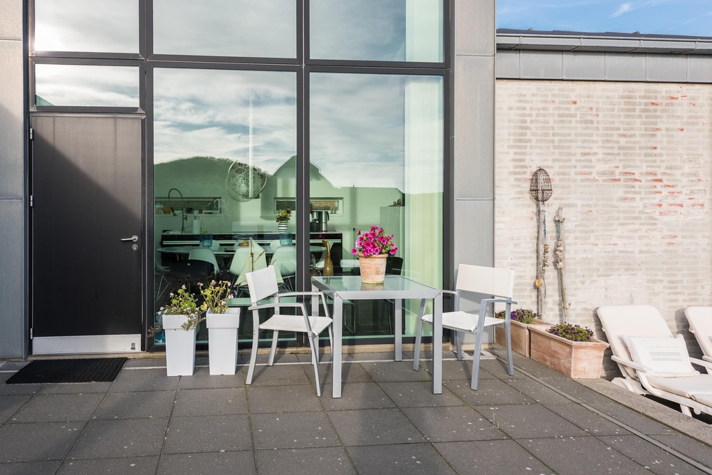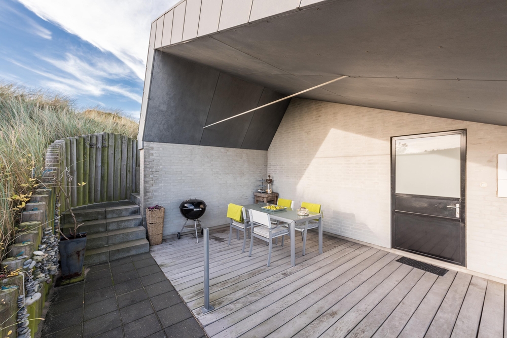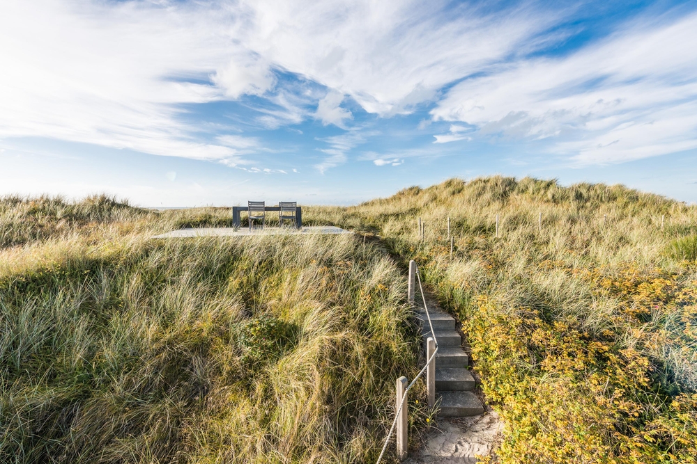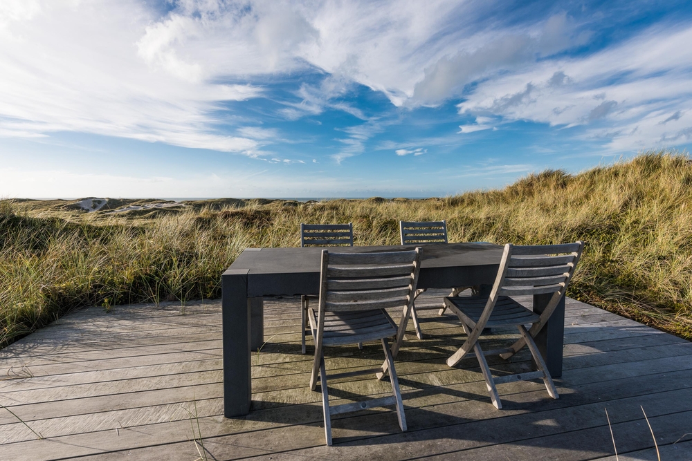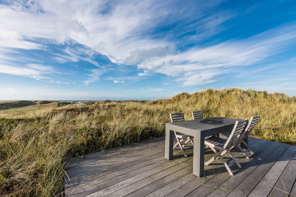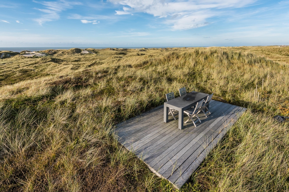 Von der erhöhten Westterrasse habt ihr einen tollen Blick auf die Dünenlandschaft und das Meer. Hier könnt ihr euch abends den Sonnenuntergang anschauen und die Zeit genießen.