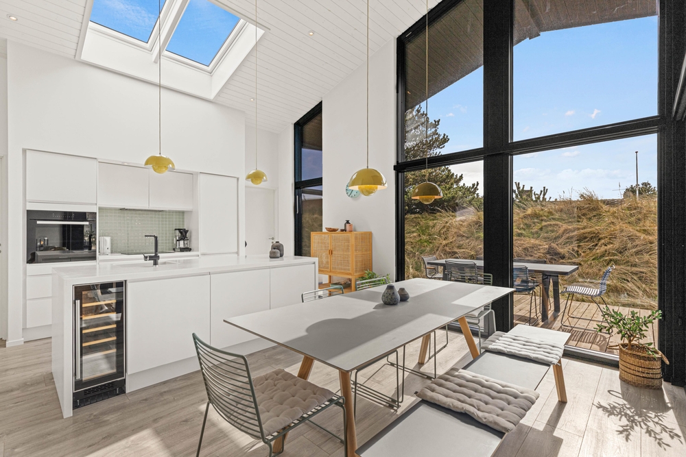 Das Ferienhaus verfügt über eine Fußbodenheizung, die mit einer Wärmepumpe betrieben wird. So könnt ihr Energie und somit Kosten einsparen. Der Wohnbereich geht in die Küche mit Essplatz über. Die offene Küche mit Insel, ist mit modernen Elektrogeräten ausgestattet. Sogar an einen Weinkühlschrank wurde gedacht.
