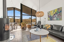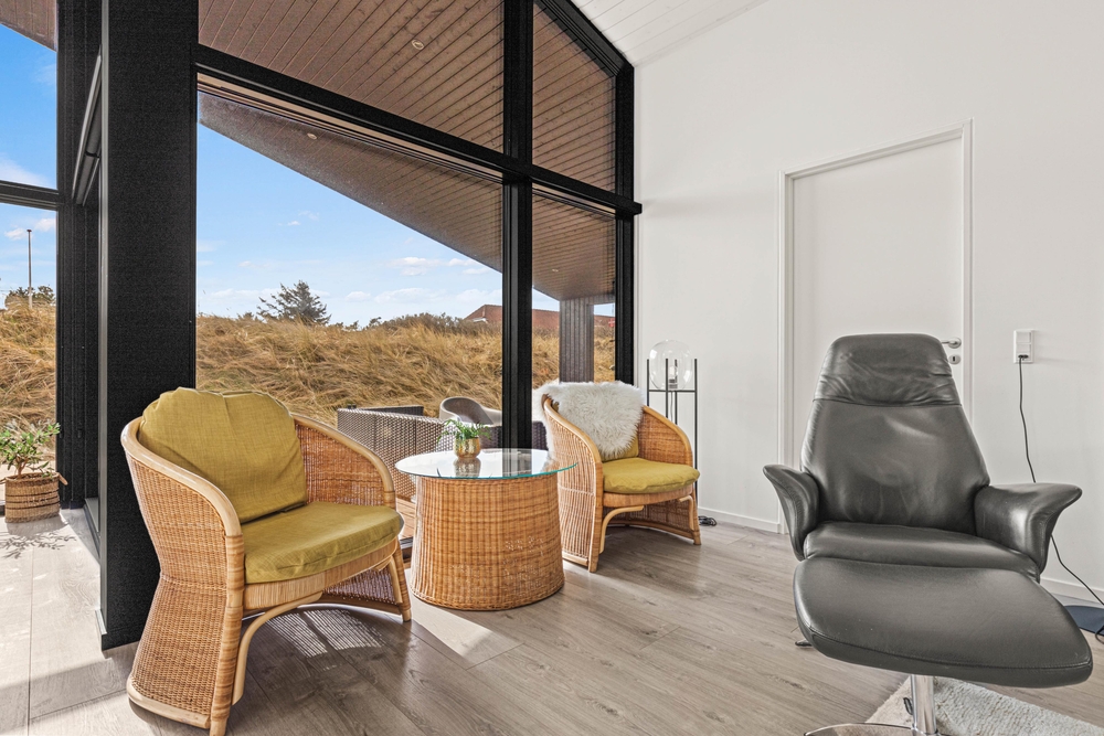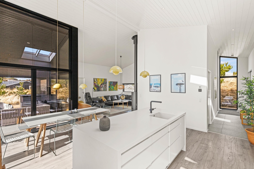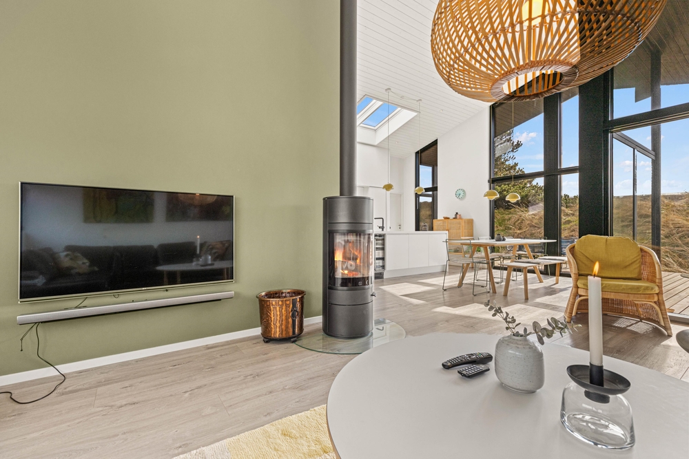 Das Zentrum eures Feriendomizils bildet der helle, freundliche Wohnbereich mit hohen Decken und großer Fensterfront. Hier könnt ihr es euch in den komfortablen Sitzmöbeln bequem machen und gemeinsam fernsehen oder dem Knistern des Kaminofens lauschen. Von hier habt ihr auch eine schöne Aussicht auf die euch umgebenden Dünen.