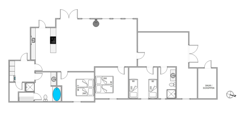 Die Einrichtung dieses tollen Luxushauses ist modern, hochwertig und einladend. Es gibt drei geräumige Schlafzimmer, eines davon mit Fernseher. Mittelpunkt des Hauses ist der grosse lichtdurchflutete Wohnraum mit offener Küche. Hier können alle Bewohner des Hauses gemeinsam viele schöne Stunden verbringen. Die moderne Küche ist mit allem ausgestattet, was man zum Zubereiten leckerer Mahlzeiten benötigt. An kühleren Tagen sorgt der Kaminofen für wohlige Wärme.