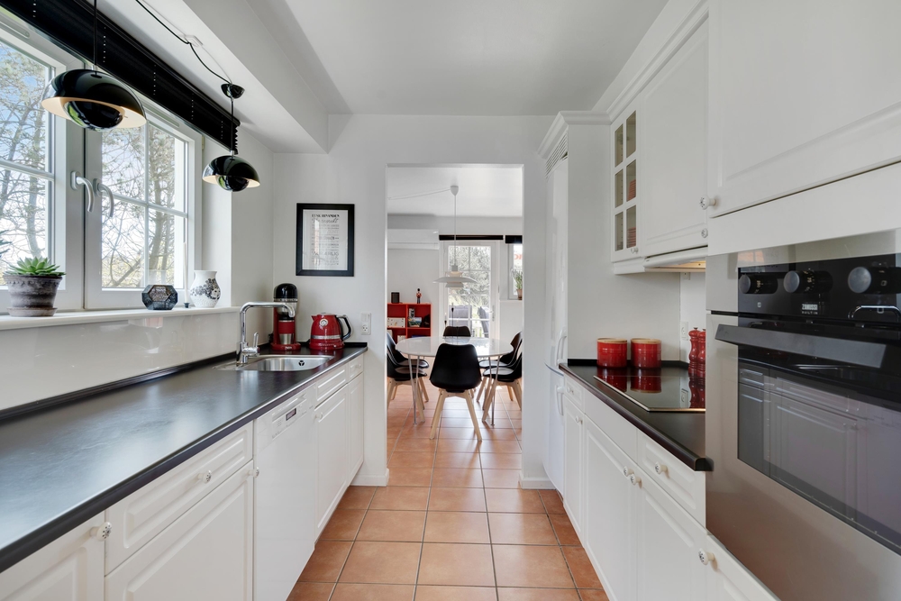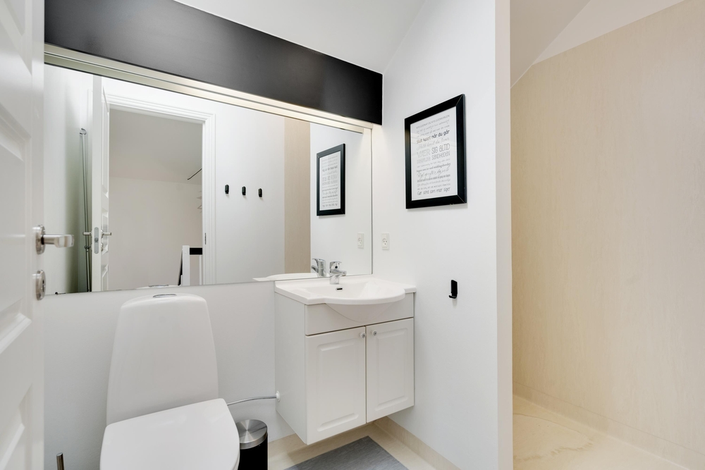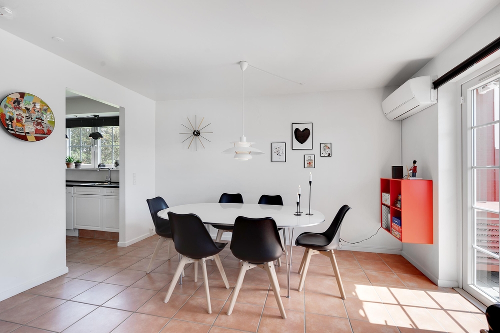 Der offene Wohn- und Essbereich sowie eines der beiden Badezimmer befinden sich im Erdgeschoss des Ferienhauses, welches im Vandflodvej 2, 26 gelegen ist.