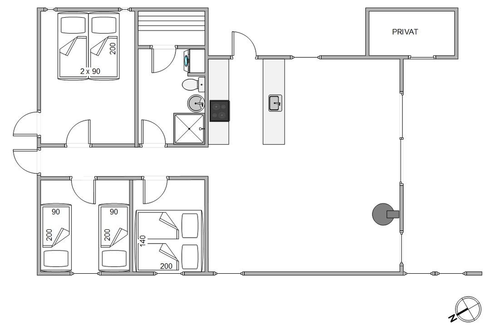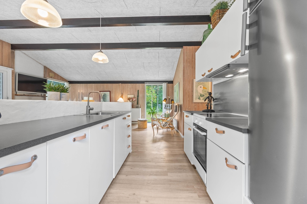 Das Herzstück des Ferienhauses ist der helle und freundliche Wohnbereich, wo sich Küche, Essbereich und Wohnzimmer in einem Raum befinden. Hier wird sich der Hobbykoch sicher sehr wohlfühlen. Die Küche ist mit allem ausgestattet, was das Herz begehrt, und durch die offene Gestaltung geht der Kontakt mit der restlichen Familie nicht verloren.