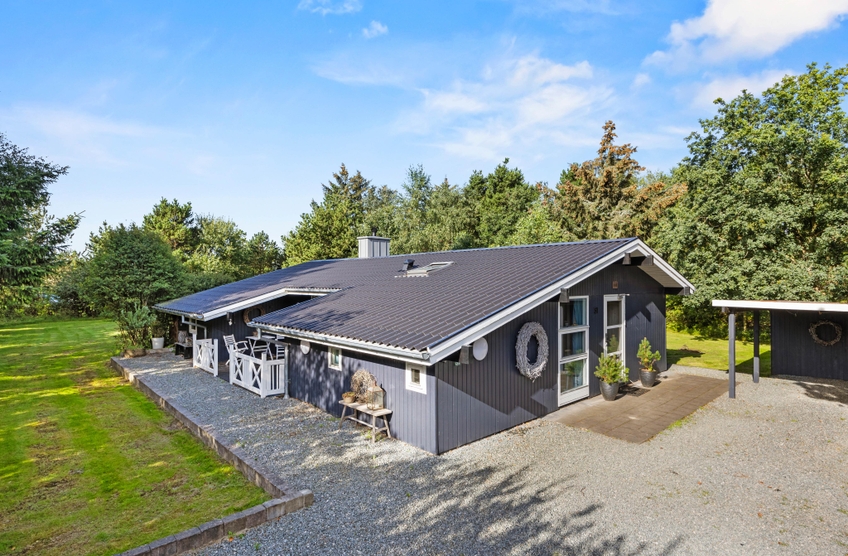 Das Ferienhaus liegt auf einem attraktiven Rasengrundstück, das von alten Bäumen abgeschirmt ist. Hier findet ihr immer einen ruhigen Platz, egal ob in der Sonne oder lieber im Schatten der alten Bäume.