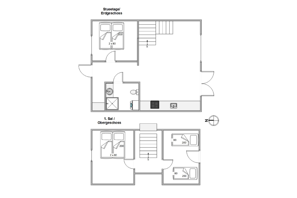 In der unteren Etage befindet sich der Wohnraum, mit der integrierten Küche, die mit allem ausgestattet ist, was ihr zum Zubereiten leckerer Ferienmahlzeiten benötigt. Der schöne Raum lädt zu vielen gemeinsamen Ferienstunden im Rahmen der Familie ein.