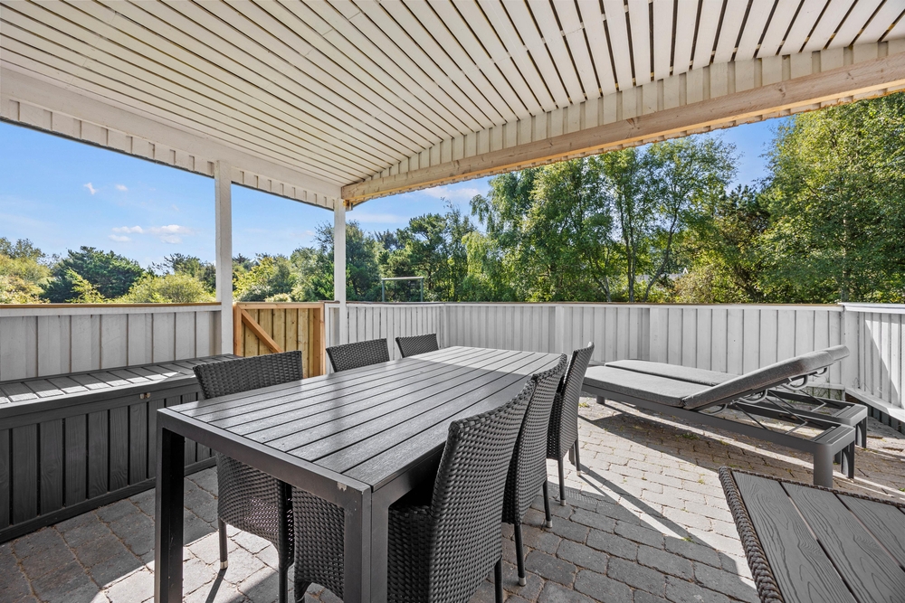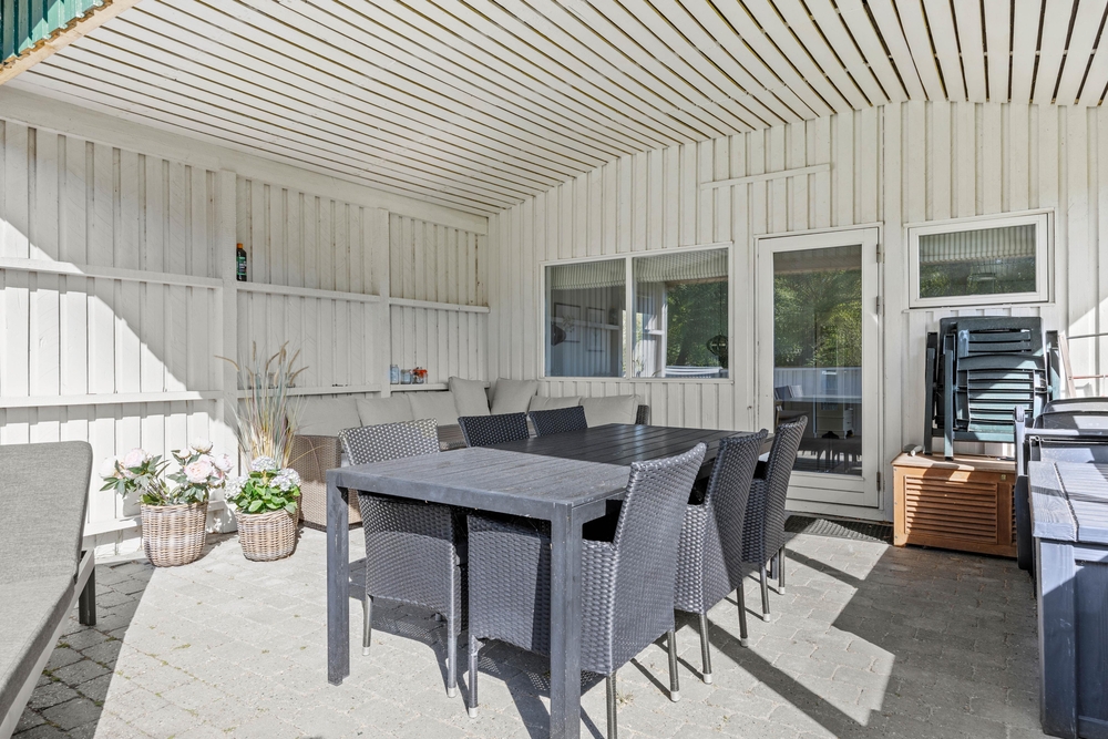 Von der Terrasse des Ferienhauses habt ihr immer den Garten im Blick, sodass ihr die Kinder und den Hund beaufsichtigen könnt. Die Terrasse bietet mehrere Sitzmöglichkeiten und ist teilweise überdacht.