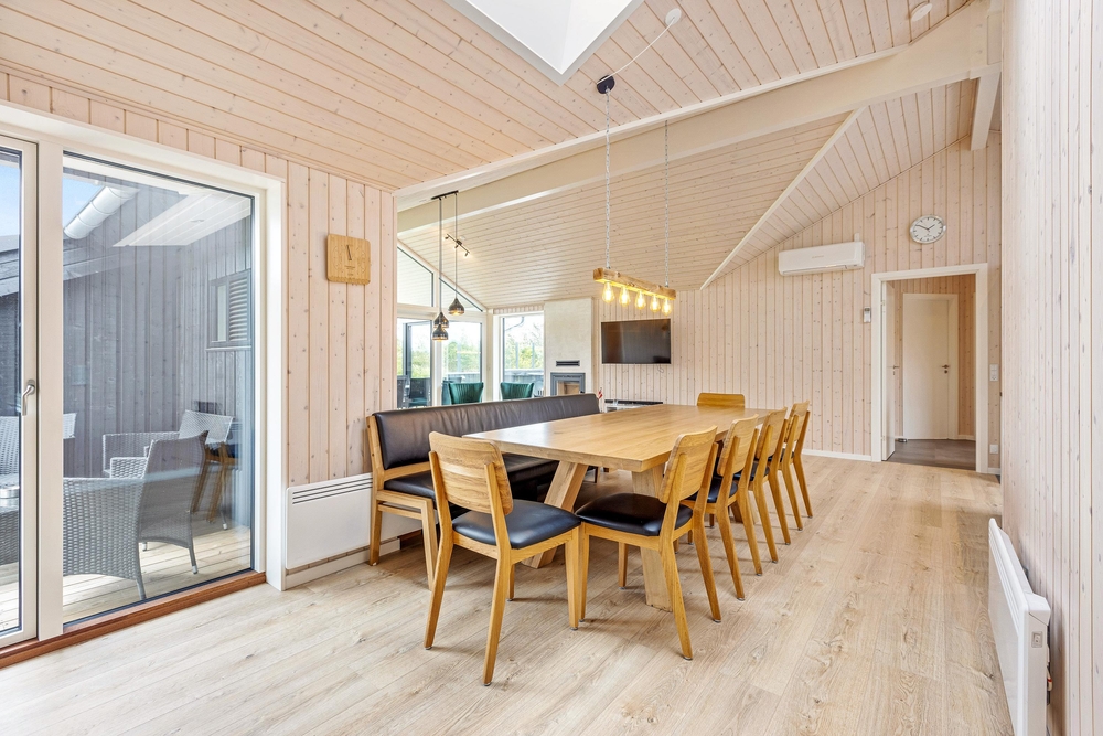 Im Zentrum des typisch skandinavischen Ferienhauses findet ihr den großzügigen Wohnraum, mit hohen Decken und einem Dachfenster über der Küche. Hier habt ihr viel natürliches Licht und könnt die freundliche Atmosphäre genießen. Im Wohnbereich findet ihr zudem den eingebauten Kamin und einen Flachbildfernseher, für gemütliche Abende mit einem spannenden Film und guter Gesellschaft. Zusätzlich könnt ihr dieses klassische Ferienhaus aber auch mit der energiesparenden Wärmepumpe heizen.