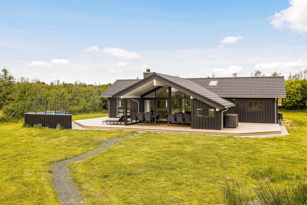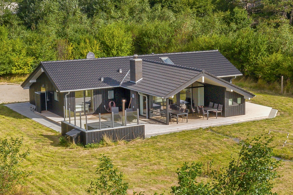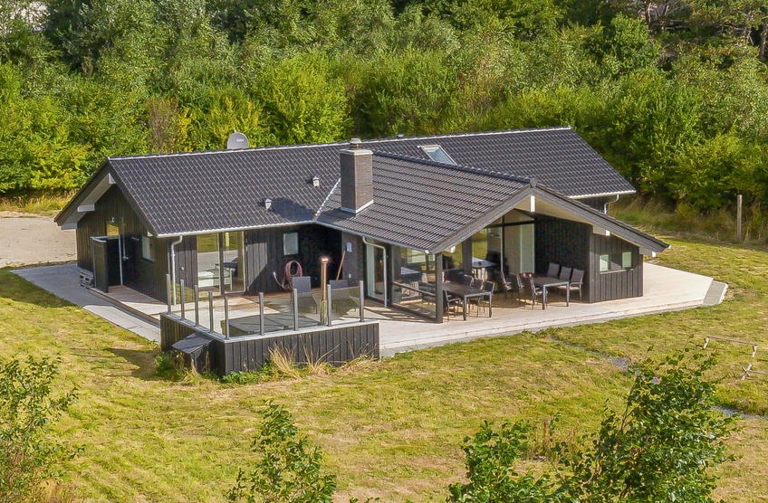 Das moderne Ferienhaus wird fast gänzlich von Terrassenbereichen umgeben. Durch die partielle Überdachung könnt ihr immer einen geschützten Platz auf den hochwertigen Terrassenmöbeln finden. Hier könnt ihr z. B. ein gutes Buch auf der Hollywoodschaukel lesen oder die Seele baumeln lassen, während eure Kinder das Grundstück erkunden.