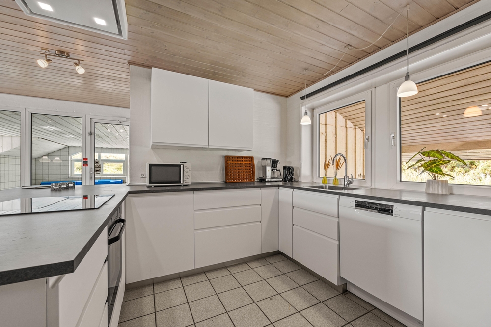 Herzstück und der zentrale Mittelpunkt dieses schönen Ferienhauses ist der offene Wohnraum. Mit Blick auf den Poolbereich sind Wohnzimmer, Esszimmer und Küche offen mit einander verbunden. Somit könnt ihr gemeinsam Essen kochen und gemütlich den Abend am Esstisch über einem Glas Wein ausklingen lassen, während sich die Kinder in den Wohnzimmerbereich zurückziehen und mit frischem Popcorn aus der Mikrowelle einen Filmabend veranstalten.